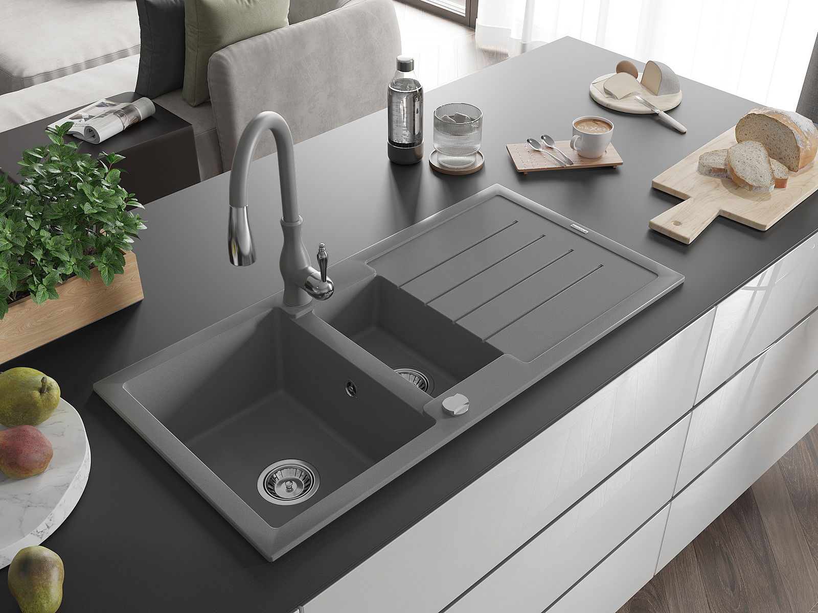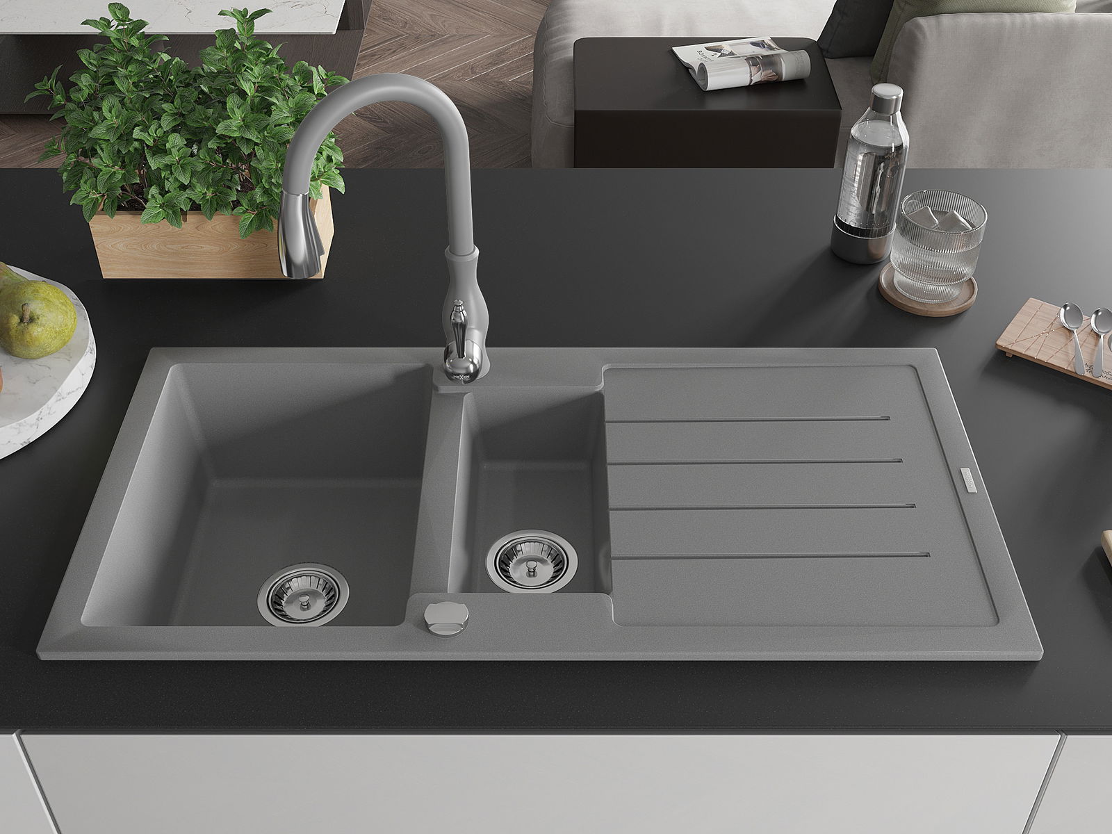 Mexen Andres 1,5 kamrás gránit mosogató csepegtetővel és Savita konyhai csapteleppel, szürke - 6515-71-672601-71