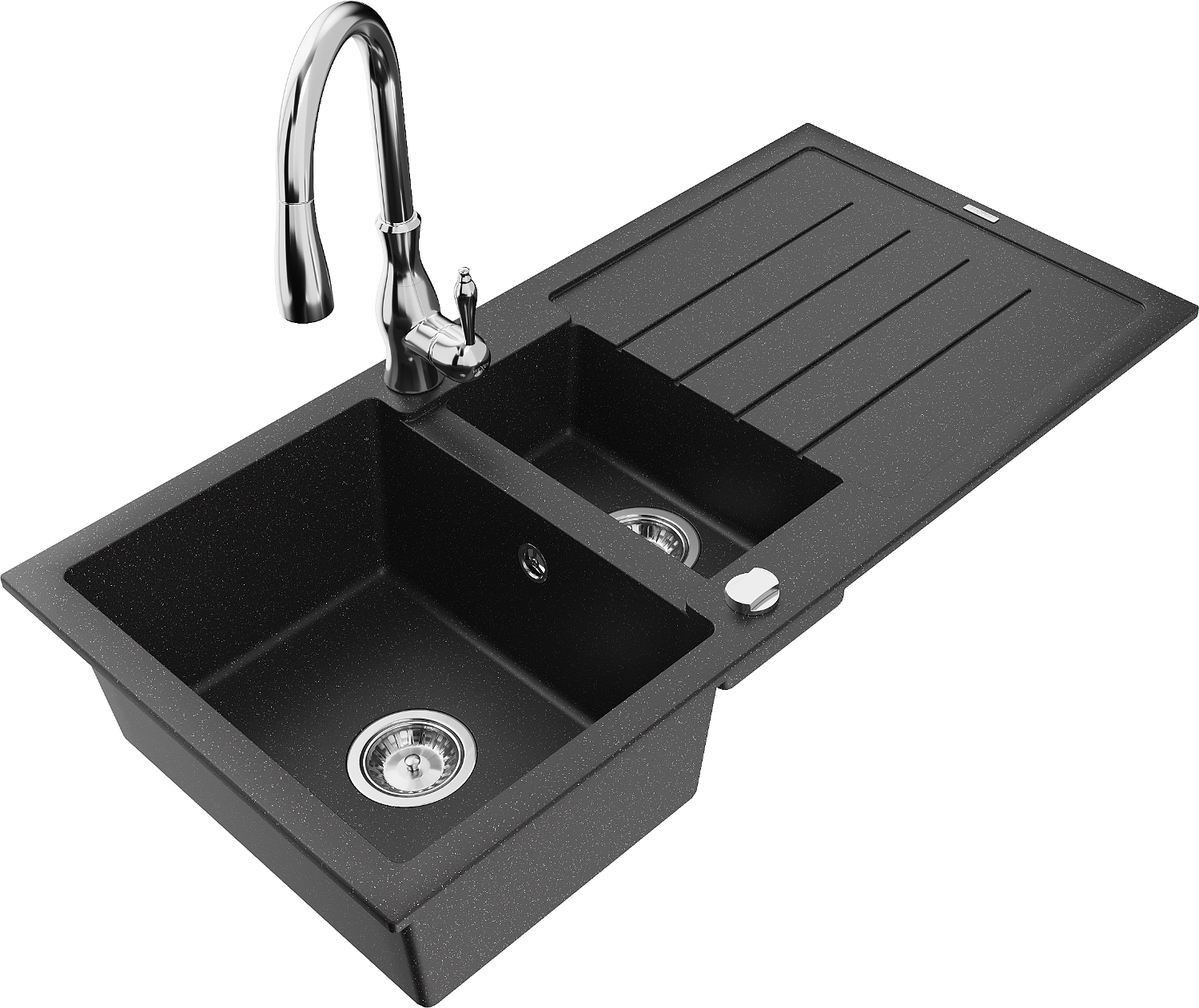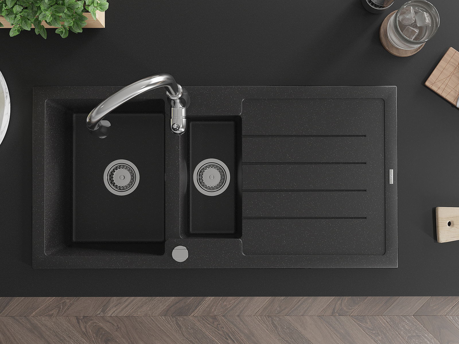 Mexen Andres gránit mosogató 1,5 rekesszel, csepptálcával és Savita konyhai csappal, fekete/ezüst - 6515-73-672601-00