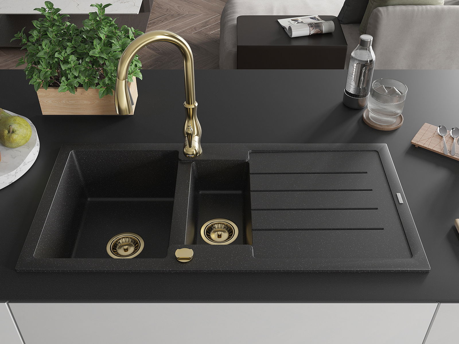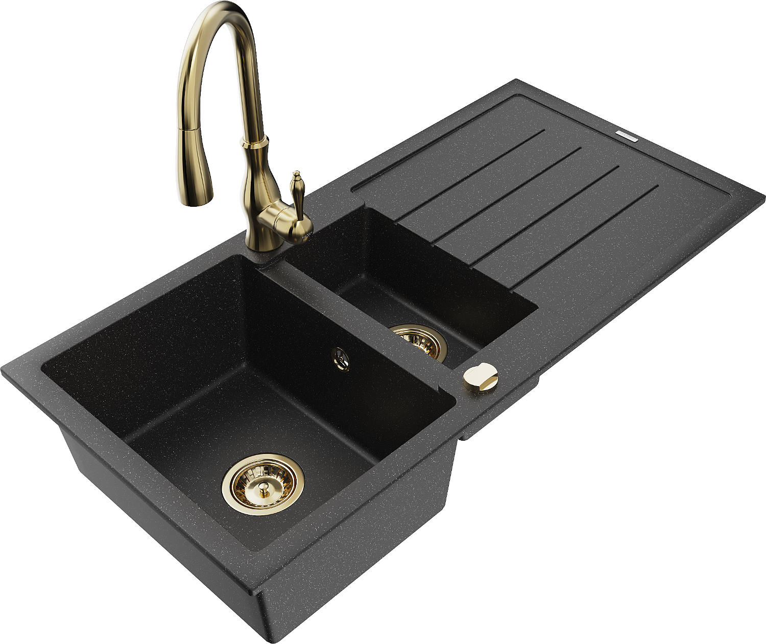 Mexen Andres gránit mosogató 1,5 medencés csepegtetővel és Savita konyhai csappal, fekete/ezüst - 6515-73-672601-50