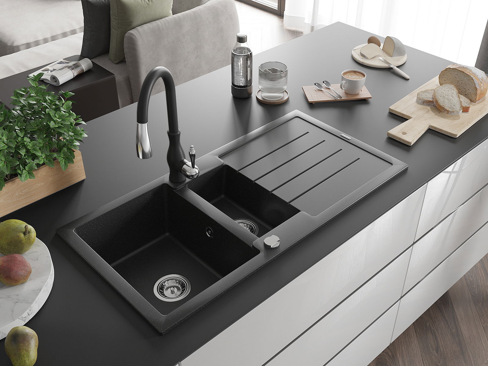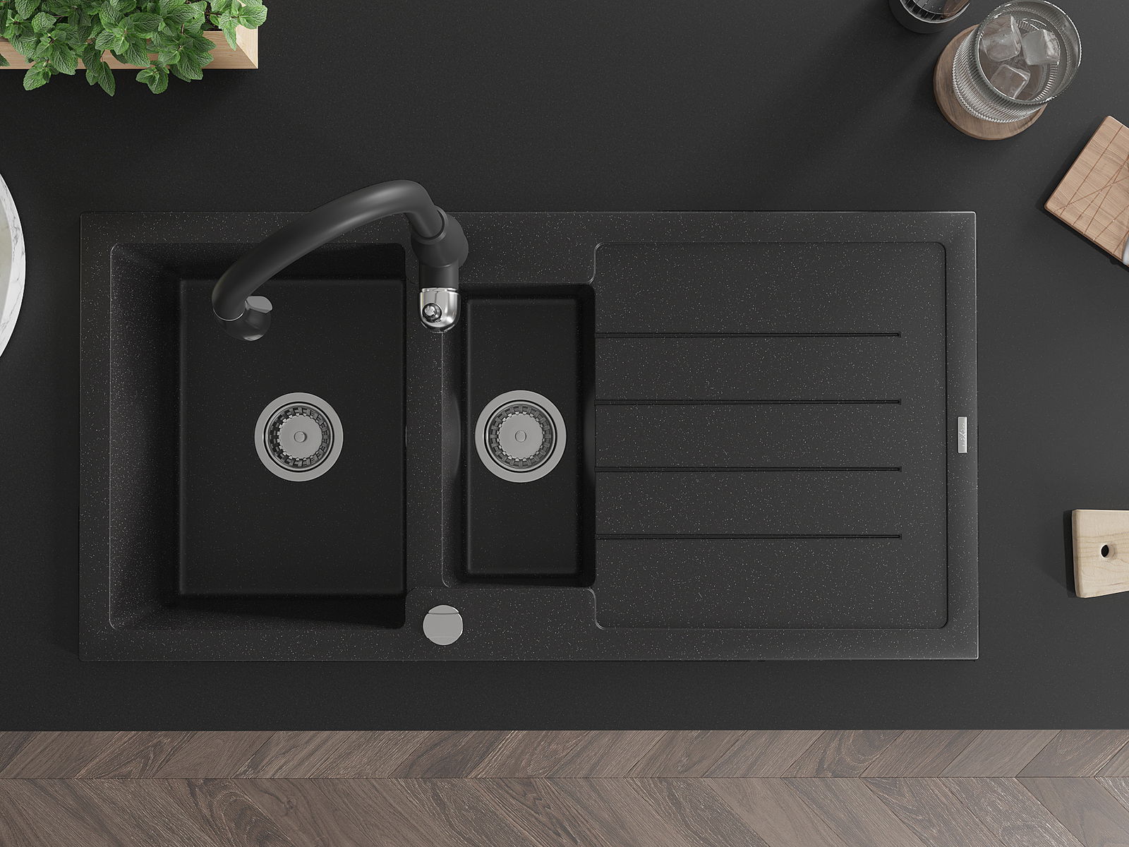 Mexen Andres 1,5 medencés gránit mosogató csepegtetővel és Savita konyhai csappal, fekete/ezüst - 6515-73-672601-70