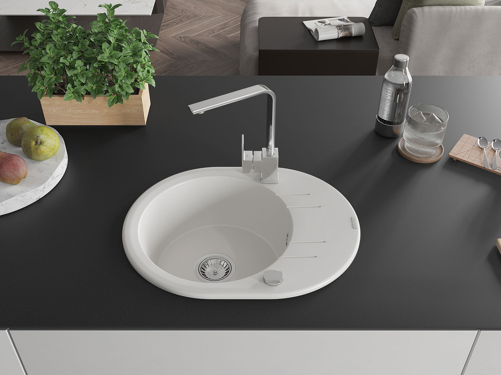 A mosogató magas minőségű gránitból készült. Elegáns, de mindenekelőtt praktikus kiegészítője minden konyhának, függetlenül annak stílusától. A gránit magas minősége és tartóssága hosszú távú használatot biztosít.