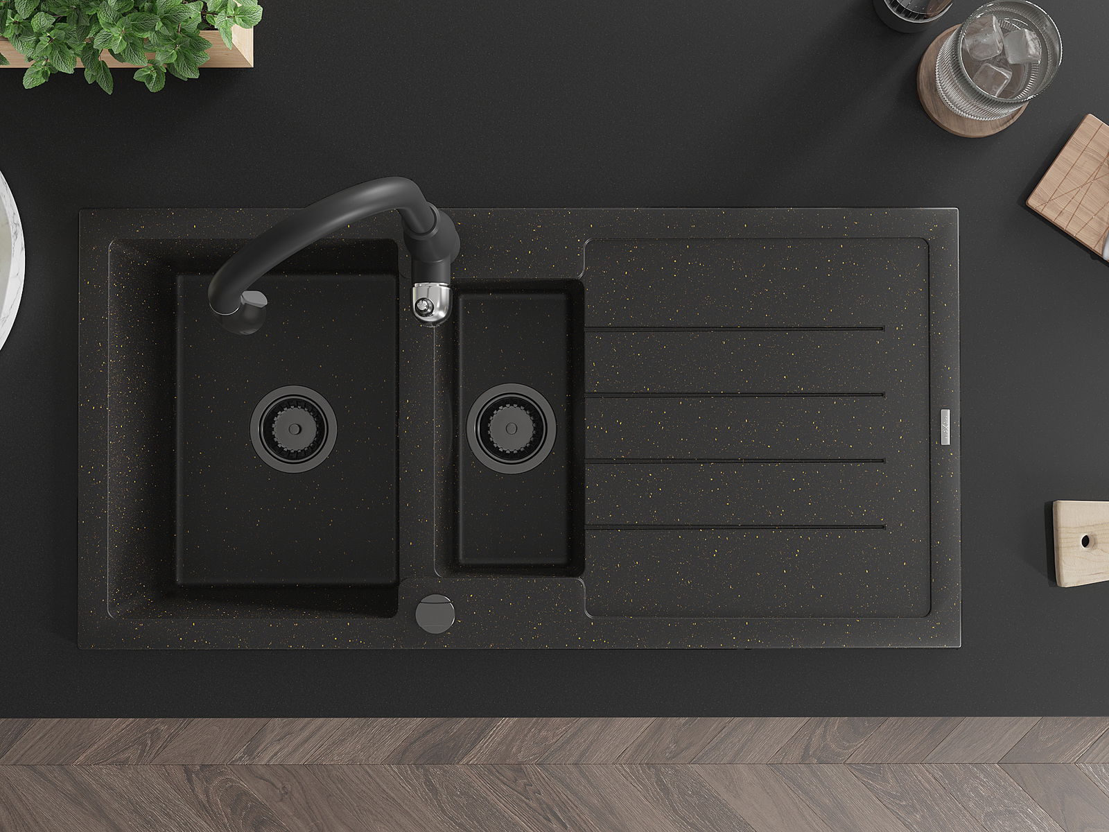 Mexen Andres gránit mosogató 1,5-medencés csepegtetővel és Savita konyhai csapteleppel, fekete/arany - 6515-75-672601-70-B