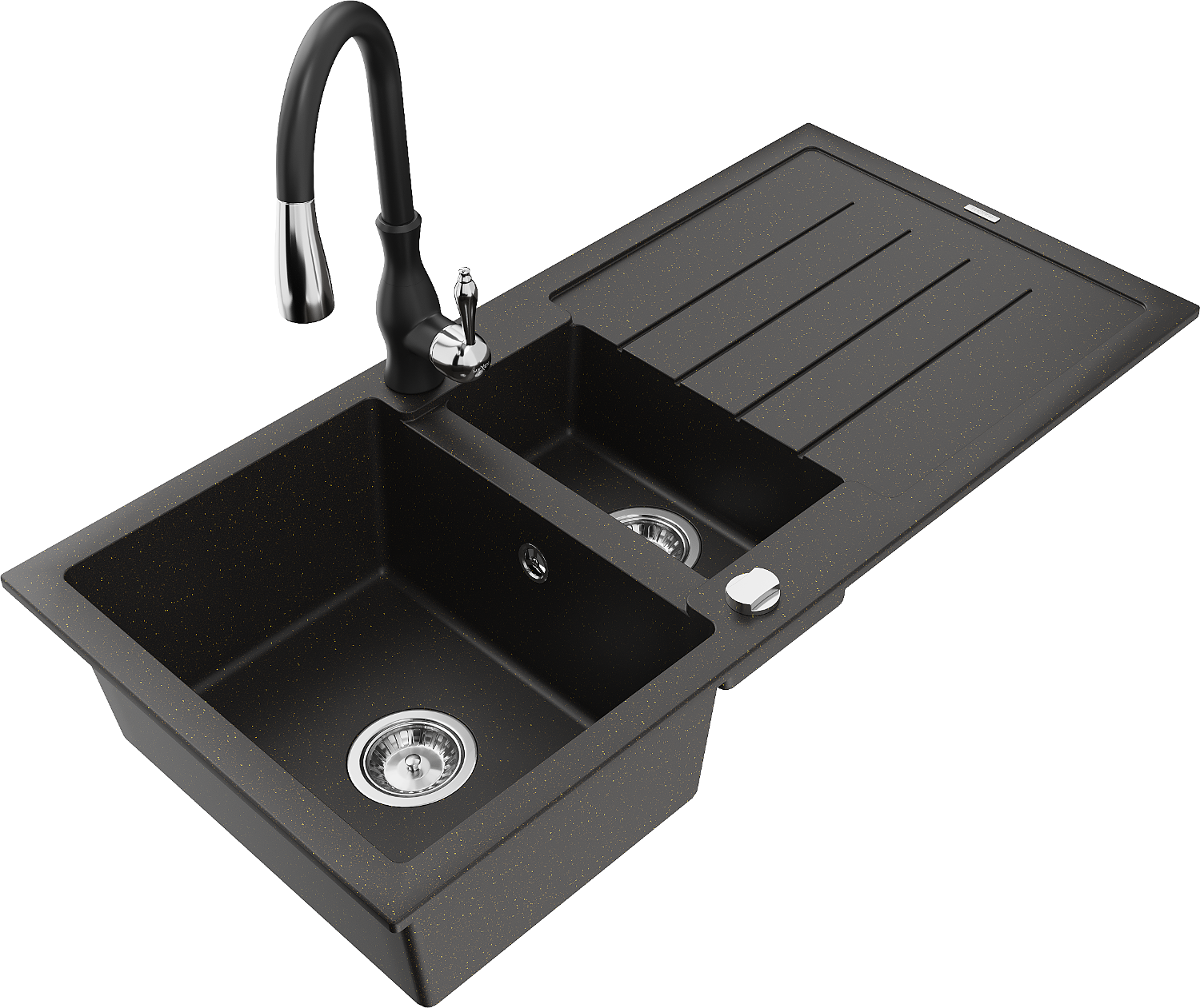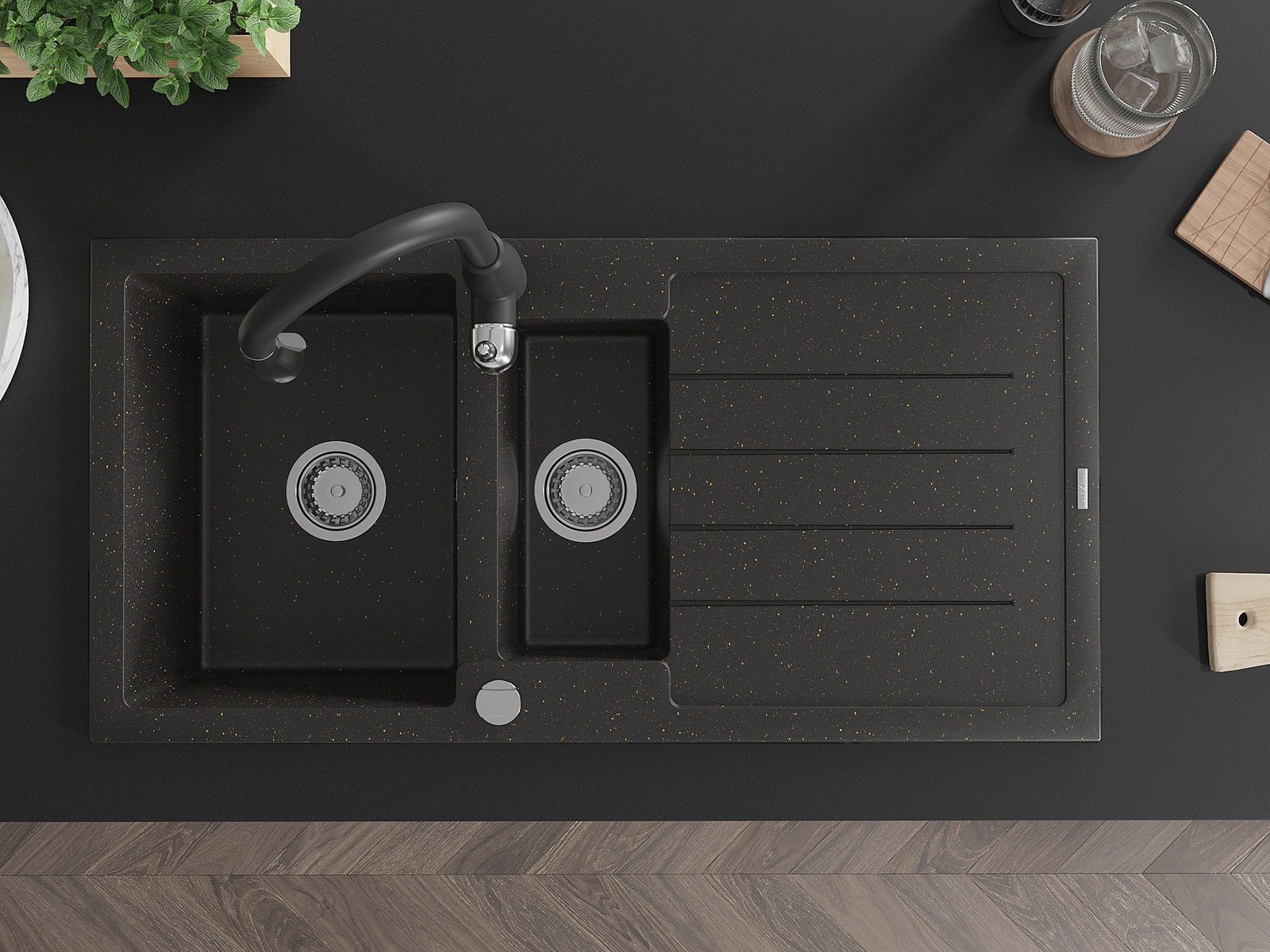 Mexen Andres 1,5 kamrás gránit mosogató csepptálcával és Savita konyhai csapteleppel, fekete/arany metál