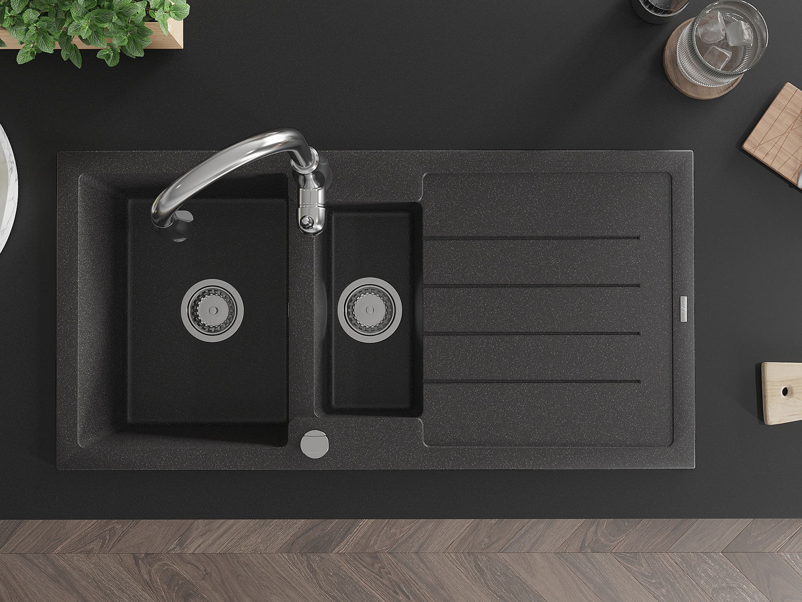 Mexen Andres 1,5-medencés gránit mosogató csepegtetővel és Savita konyhai csapteleppel, fekete pöttyös - 6515-76-672601-00