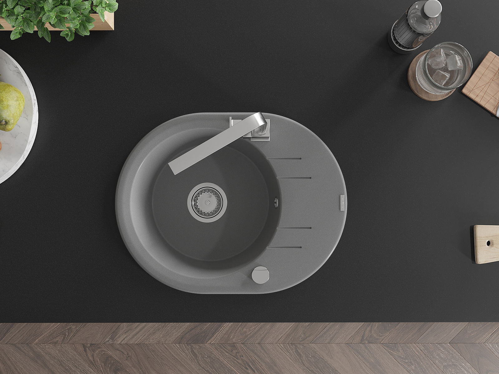A mosogató magas minőségű gránitból készült. Elegáns, de mindenekelőtt praktikus kiegészítője minden konyhának, függetlenül annak stílusától. A gránit magas minősége és tartóssága hosszú távú használatot biztosít.