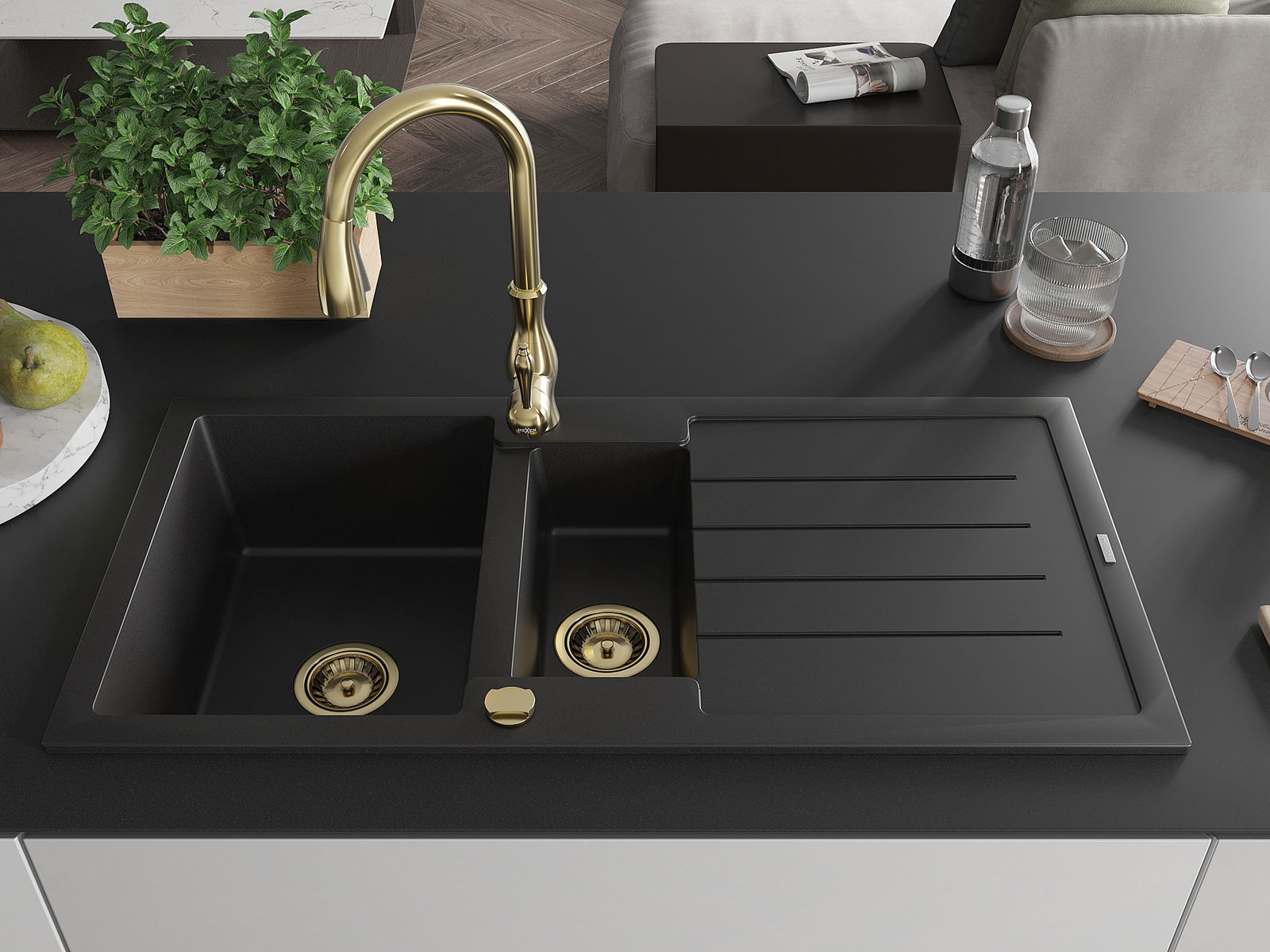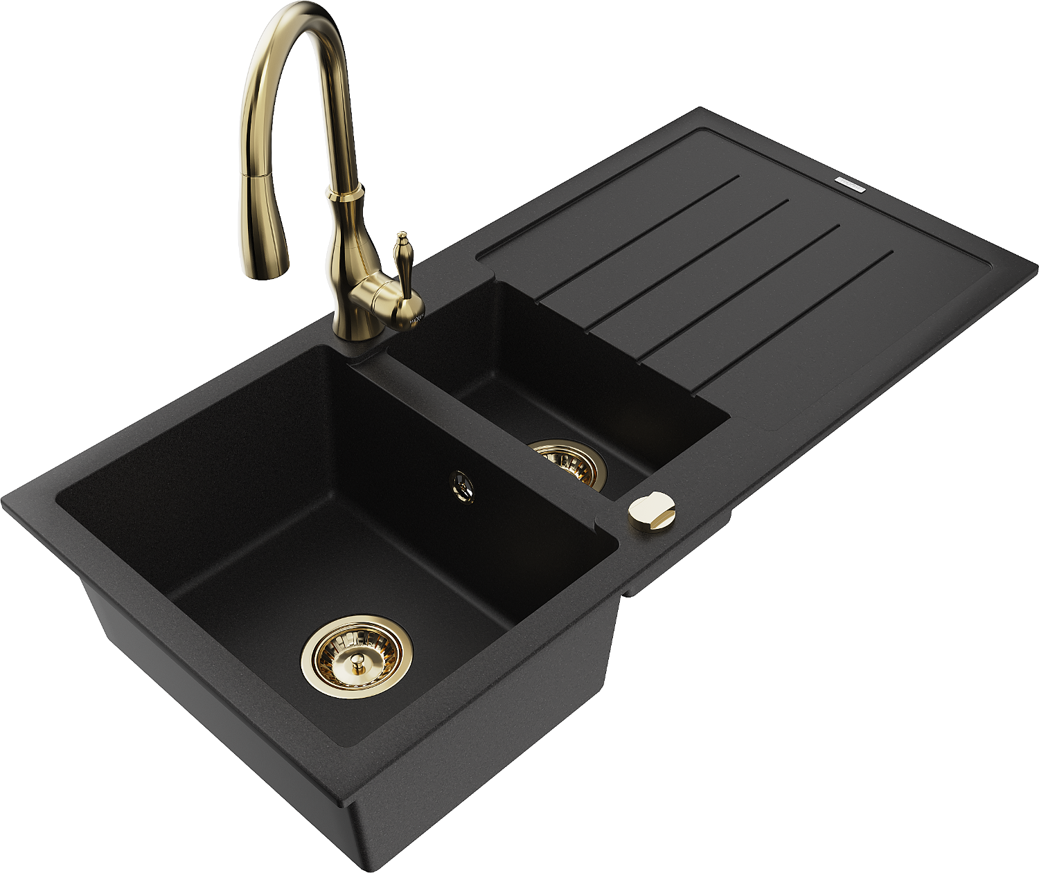 Mexen Andres 1,5-medencés gránit mosogató csepegtetővel és Savita konyhai csapteleppel, fekete - 6515-77-672601-50