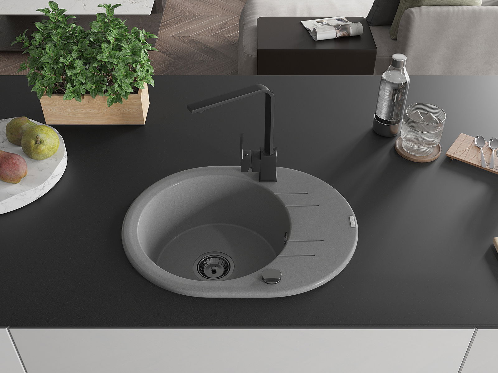 A mosogató magas minőségű gránitból készült. Elegáns, de mindenekelőtt praktikus kiegészítője minden konyhának, függetlenül annak stílusától. A gránit magas minősége és tartóssága hosszú távú használatot biztosít.