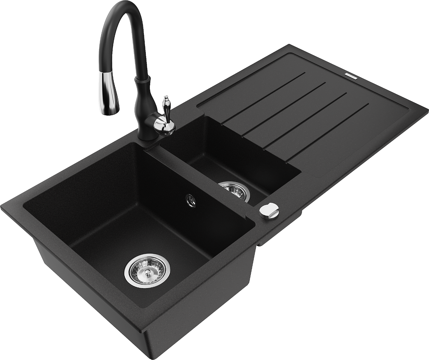 Mexen Andres 1,5-medencés gránit mosogató csepegtetőtálcával és Savita konyhai csapteleppel, fekete - 6515-77-672601-70
