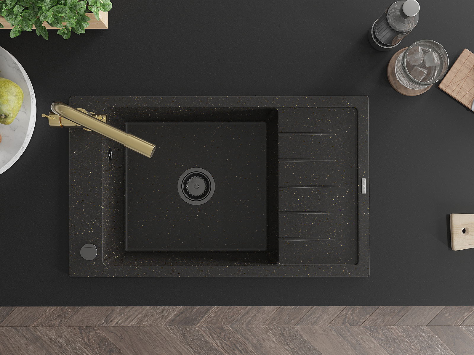 Mexen Elias gránit mosogató 1-medencés csepegtetővel és Duero konyhai csapteleppel, fekete/arany metál - 6511-75-671600-50-B