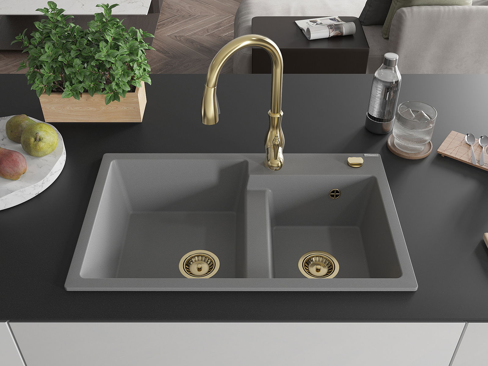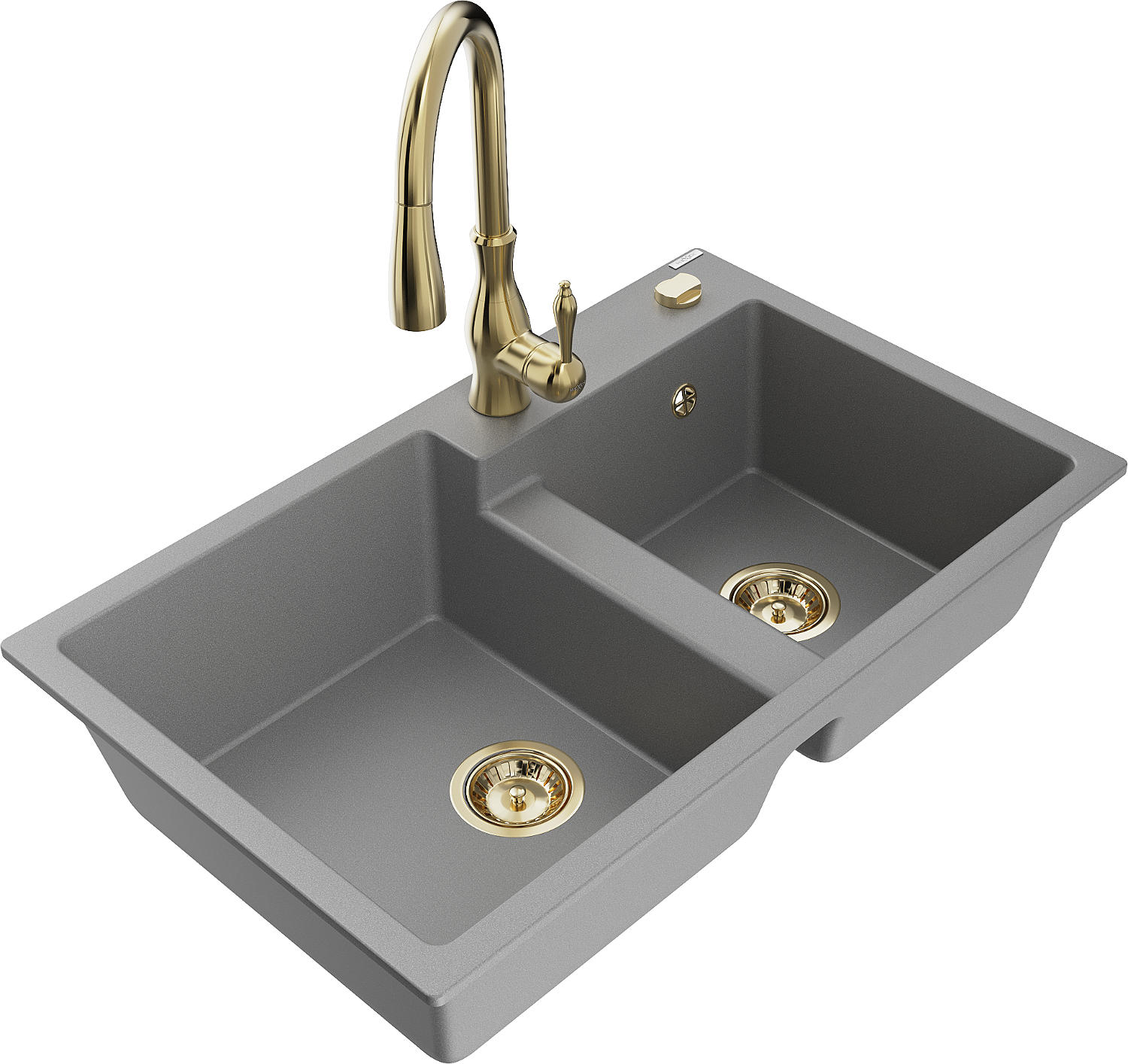 Mexen Tomas gránit mosogató 2 medencés konyhai csappal Savita, szürke - 6516-71-672601-50
