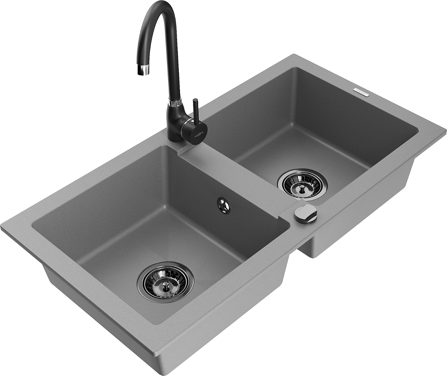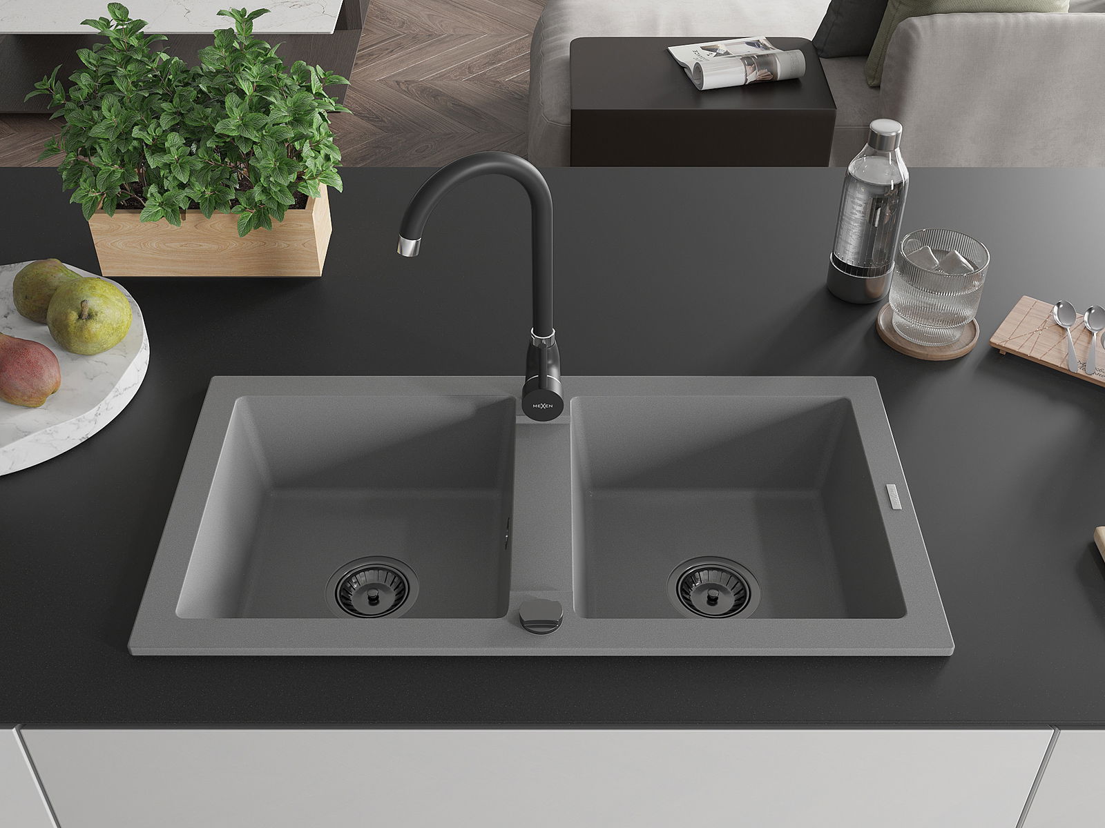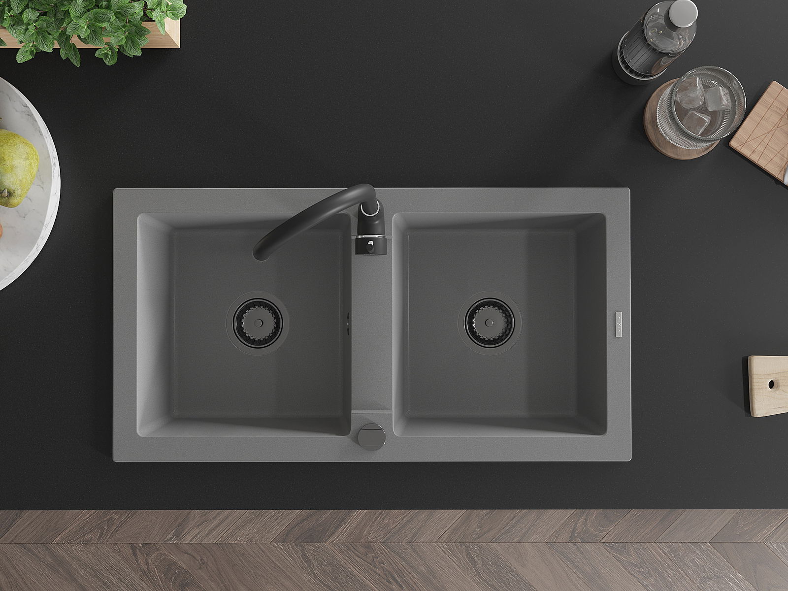 Mexen Mario kétkamrás gránit mosogató Telma konyhai csapteleppel, szürke - 6504-71-670200-70-B