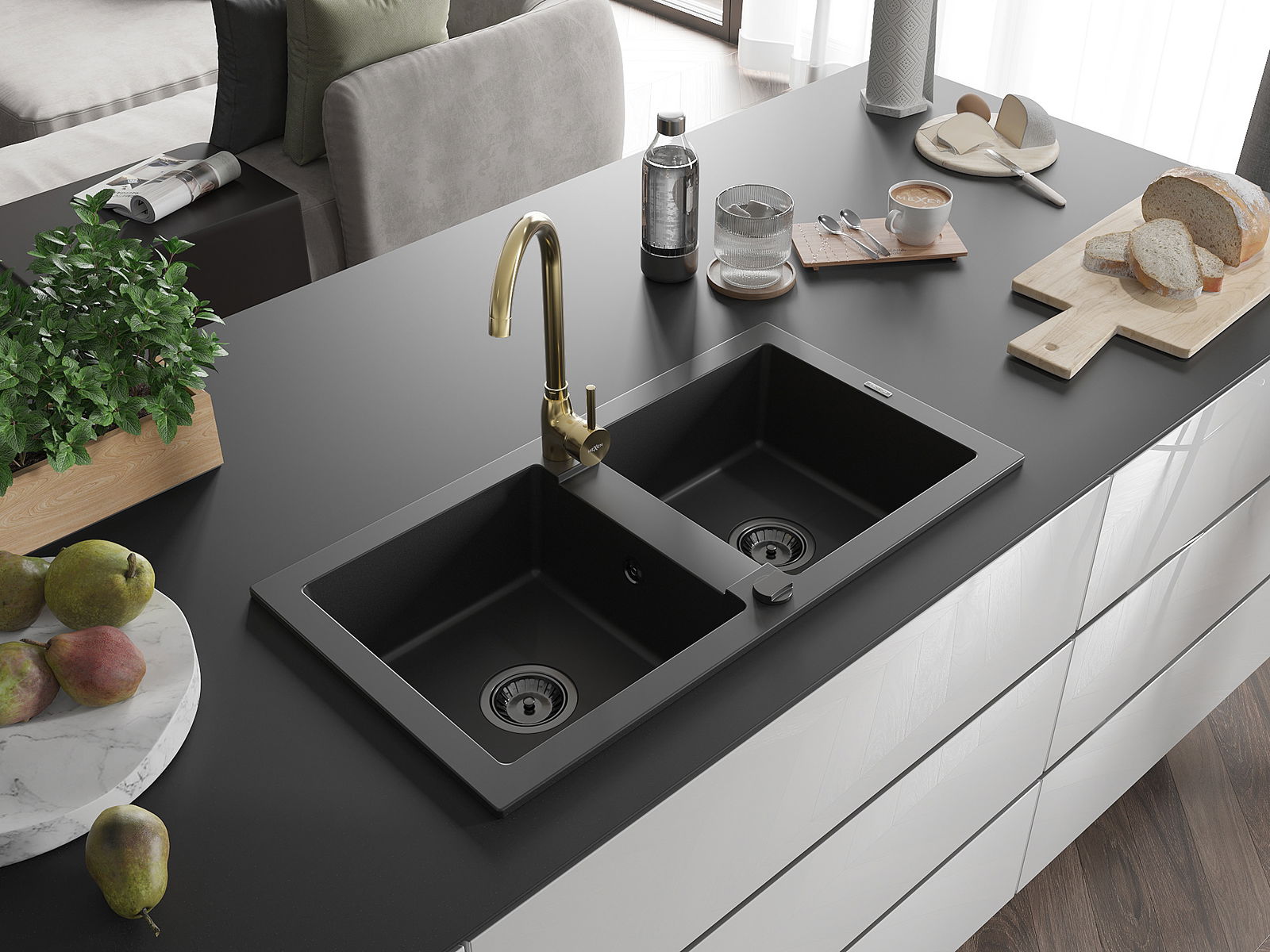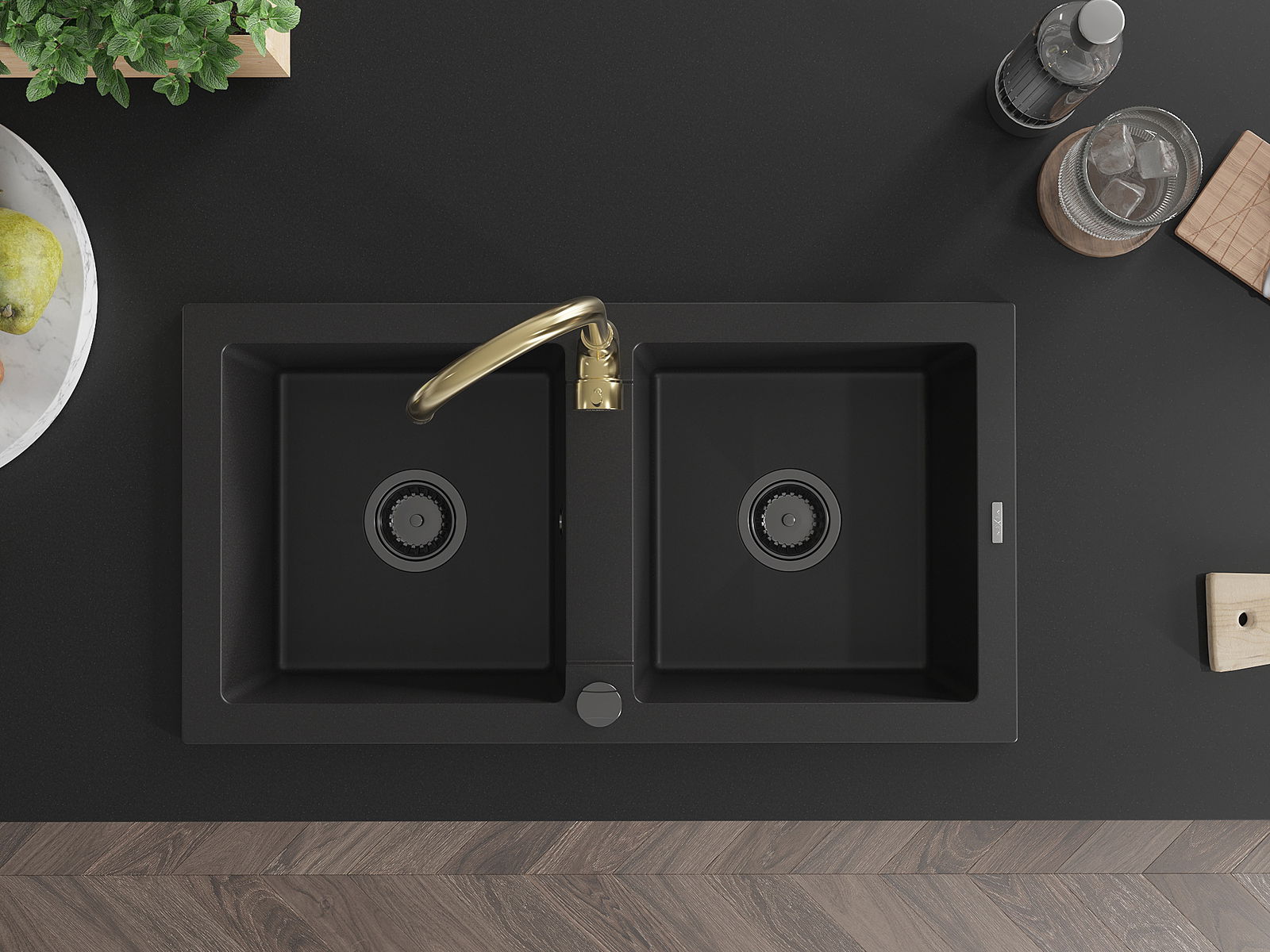 Mexen Mario gránit 2-medencés mosogató Telma konyhai csappal, fekete - 6504-77-670200-50-B