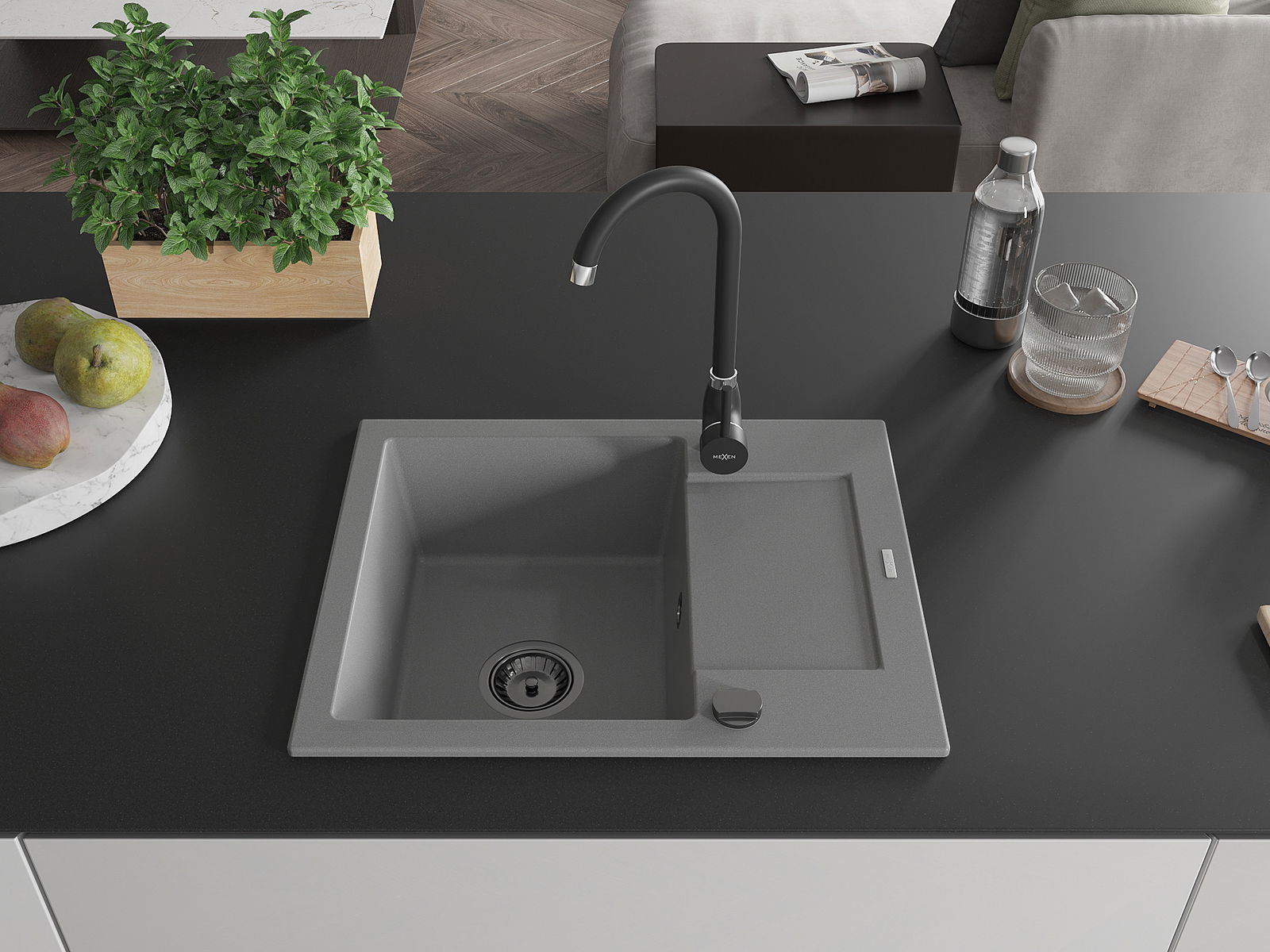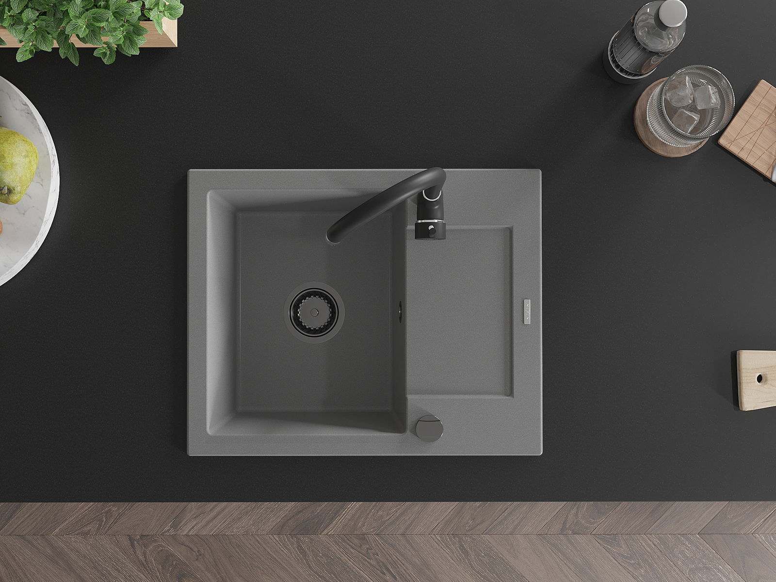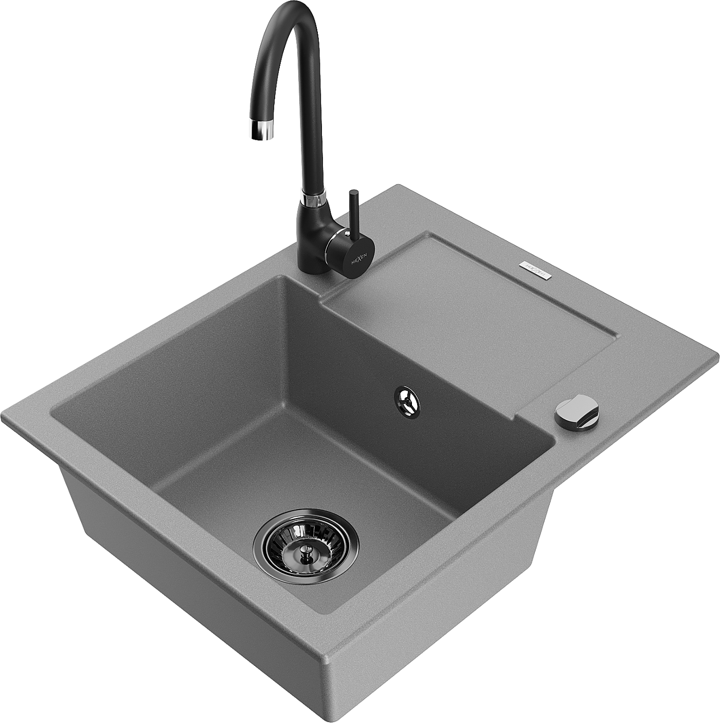 Mexen Enzo egymedencés gránit mosogató csepegtetővel és Telma konyhai csapteleppel, szürke - 6506-71-670200-70-B