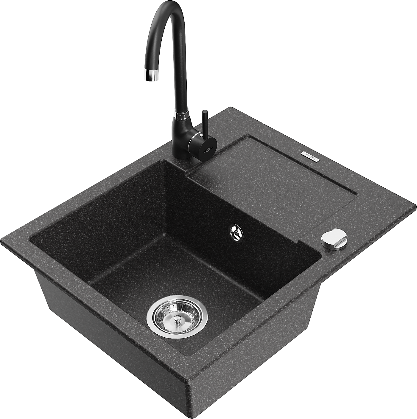 Mexen Enzo 1-medencés gránit mosogató csepegtetővel és Telma konyhai csapteleppel, fekete pöttyös - 6506-76-670200-70