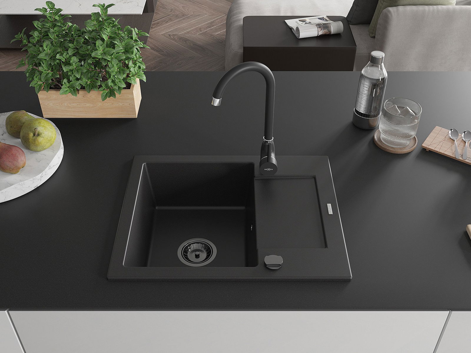Mexen Enzo egymedencés gránit mosogató lefolyótálcával és Telma konyhai csapteleppel, fekete - 6506-77-670200-70-B