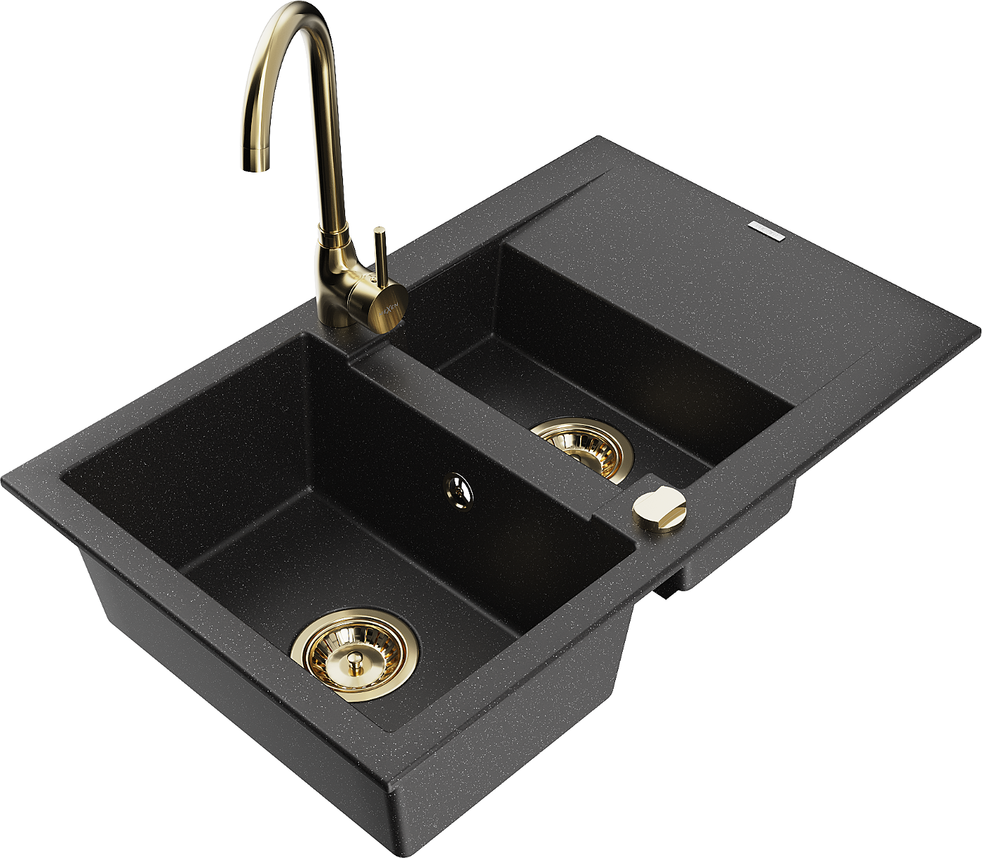 Mexen Gaspar 1,5 medencés gránit mosogató csepegtetővel és Telma konyhai csapteleppel, fekete/ezüst - 6507-73-670200-50