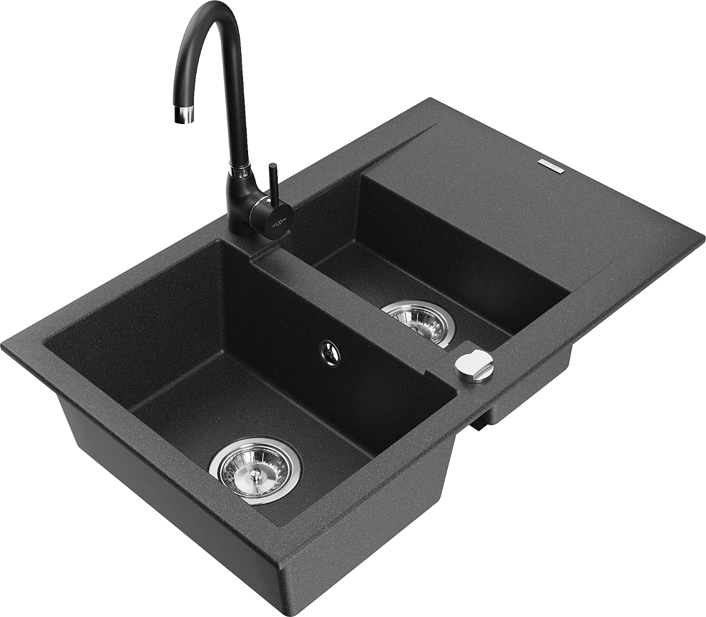 Mexen Gaspar, 1,5 rekeszes gránit mosogató csepegtetővel és Telma konyhai csapteleppel, fekete pöttyös - 6507-76-670200-70