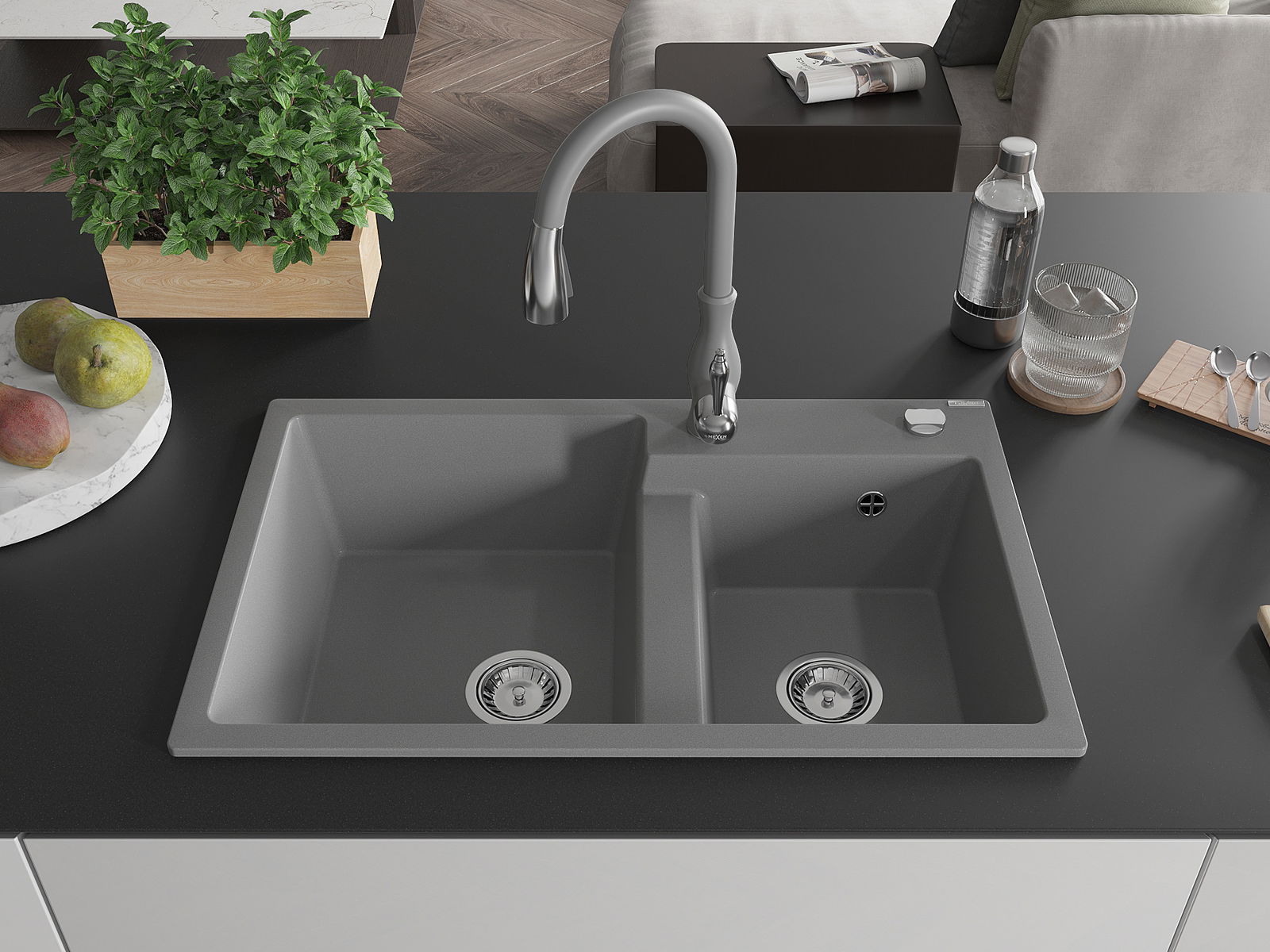 Mexen Tomas gránit mosogató 2 rekeszes konyhai csappal Savita, szürke - 6516-71-672601-71