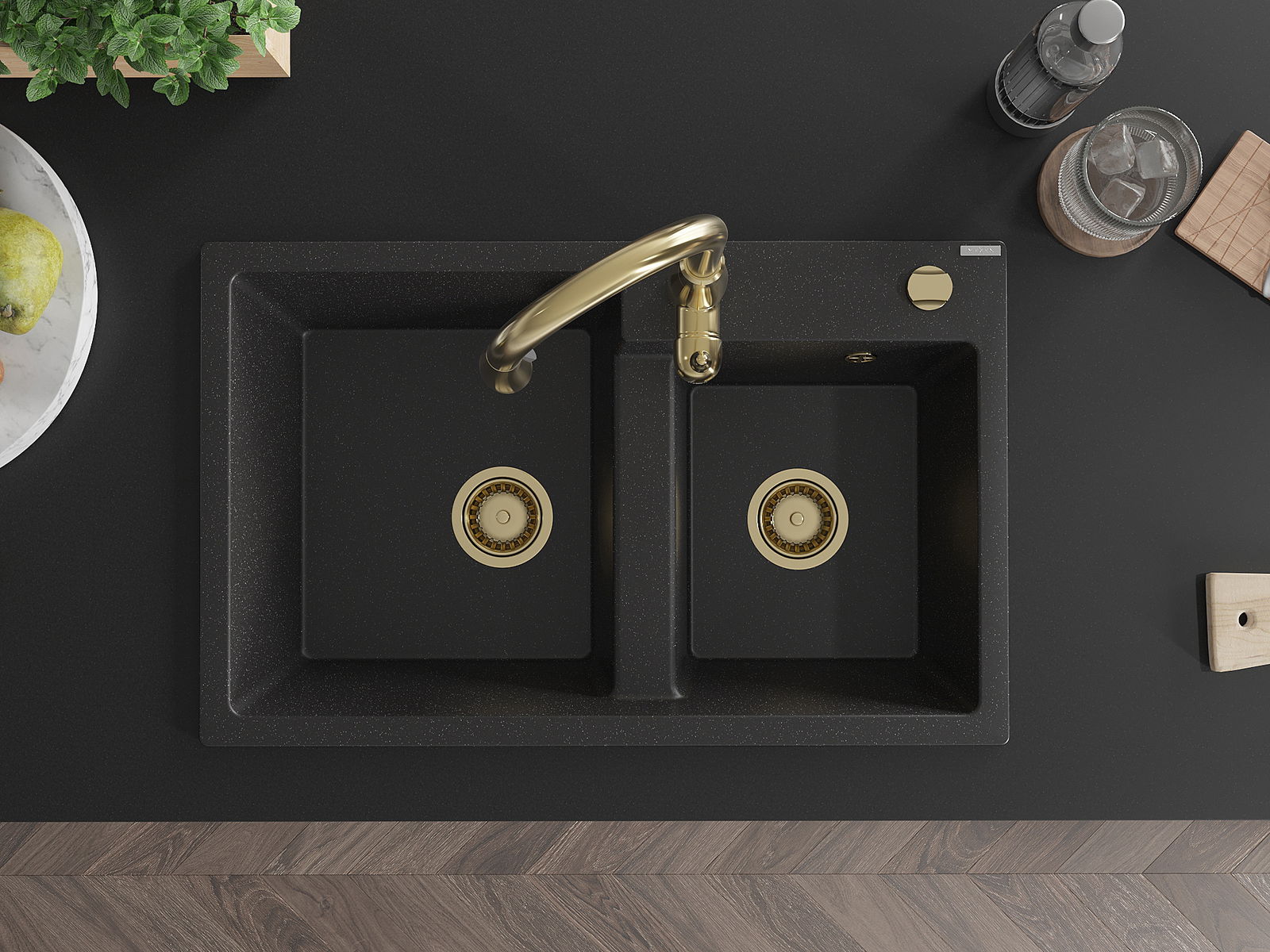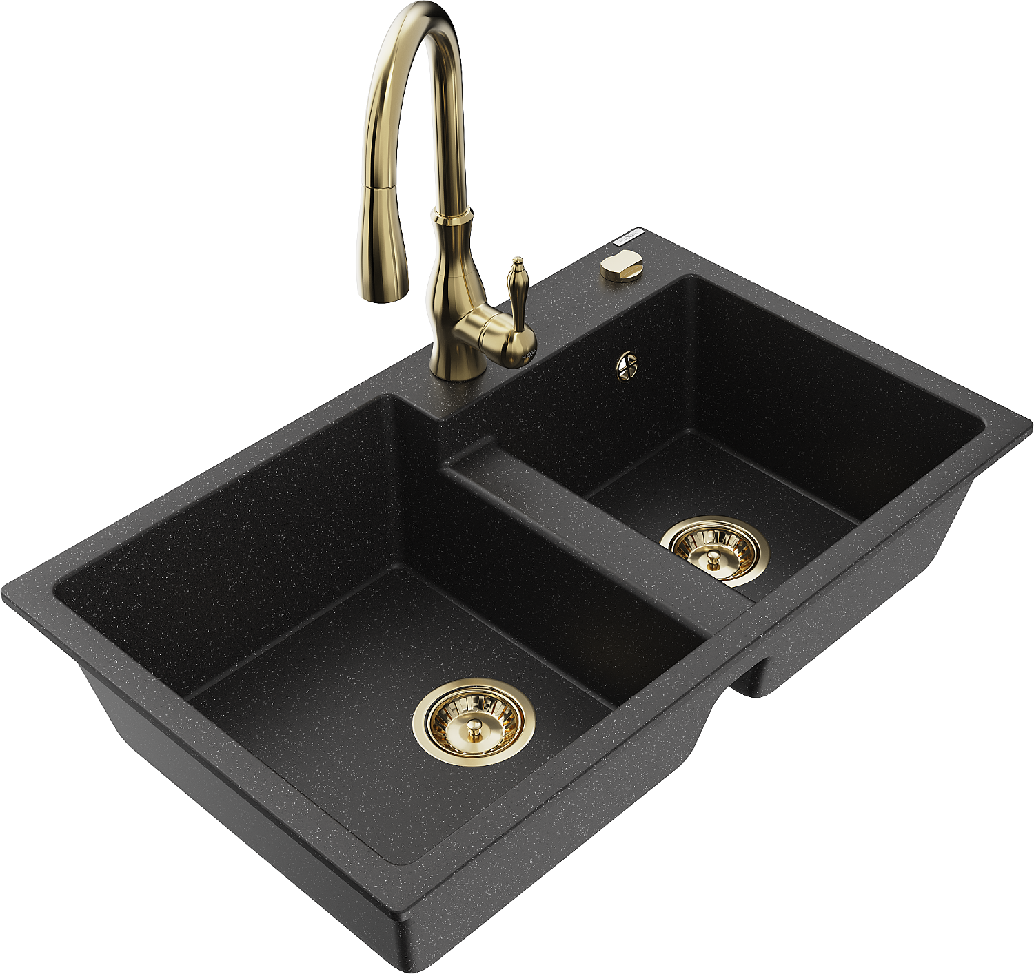 Mexen Tomas 2-kamrás gránit mosogató konyhai csapteleppel Savita, fekete/ezüst metál - 6516-73-672601-50