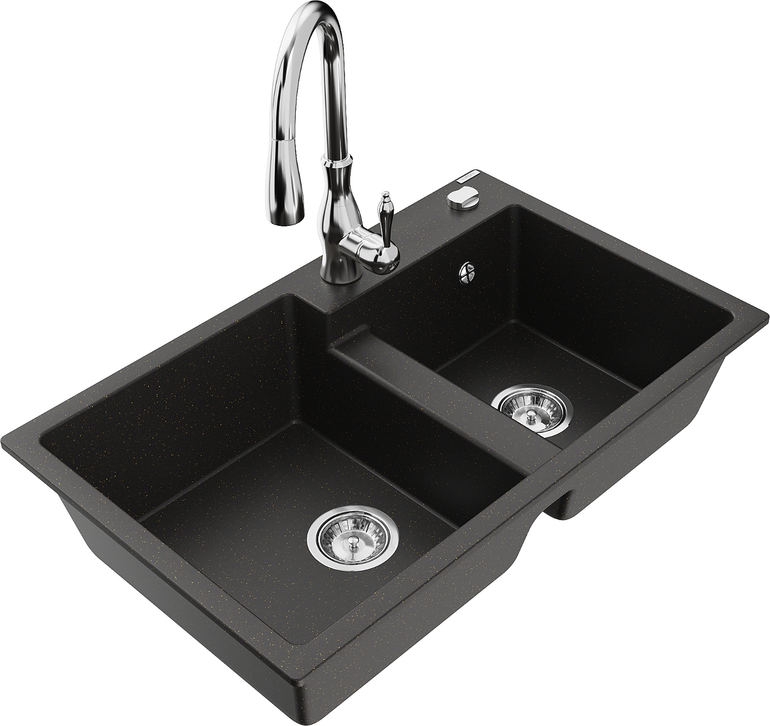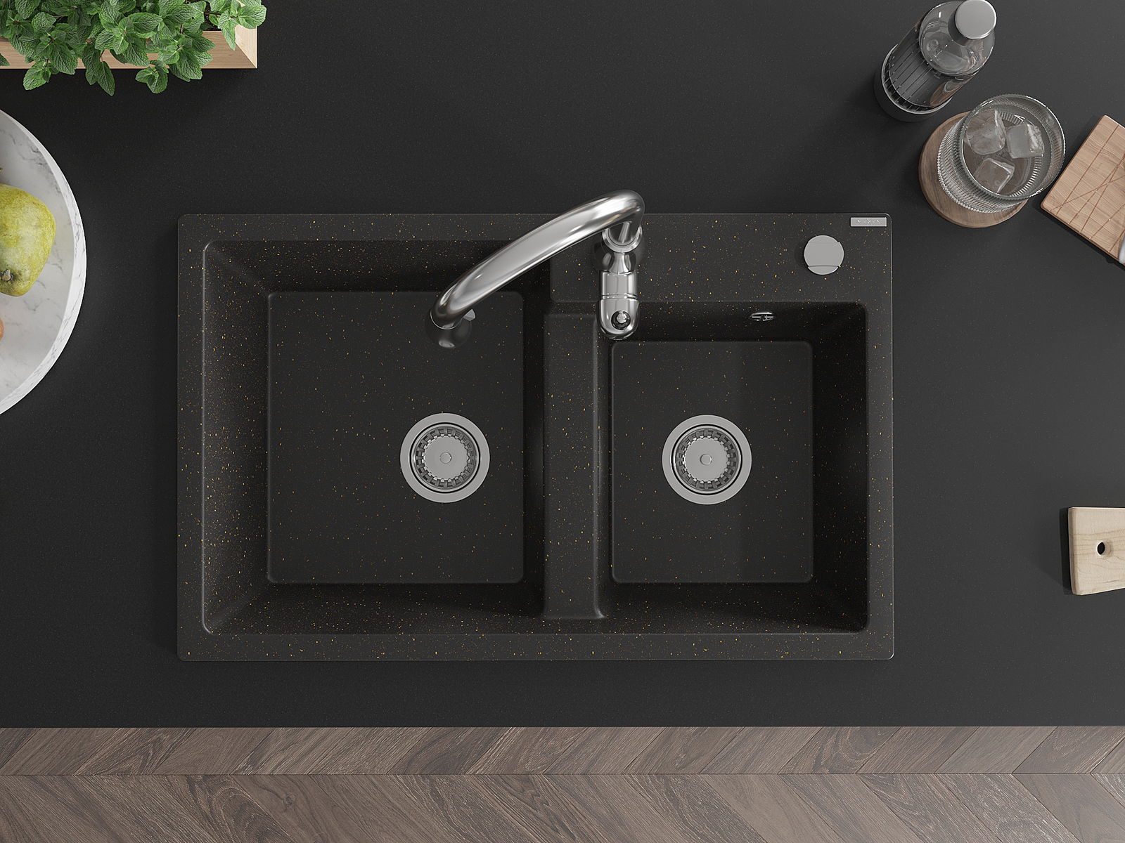 Mexen Tomasz gránit mosogatókagyló 2 rekeszes konyhai csapteleppel Savita, fekete/arany metál - 6516-75-672601-00