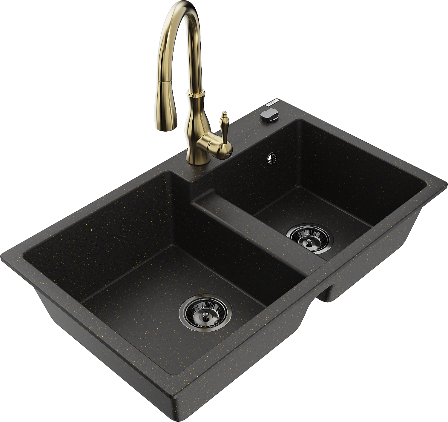 Mexen Tomas 2 rekeszes gránit mosogató Savita konyhai csapteleppel, fekete/arany metál - 6516-75-672601-50-B