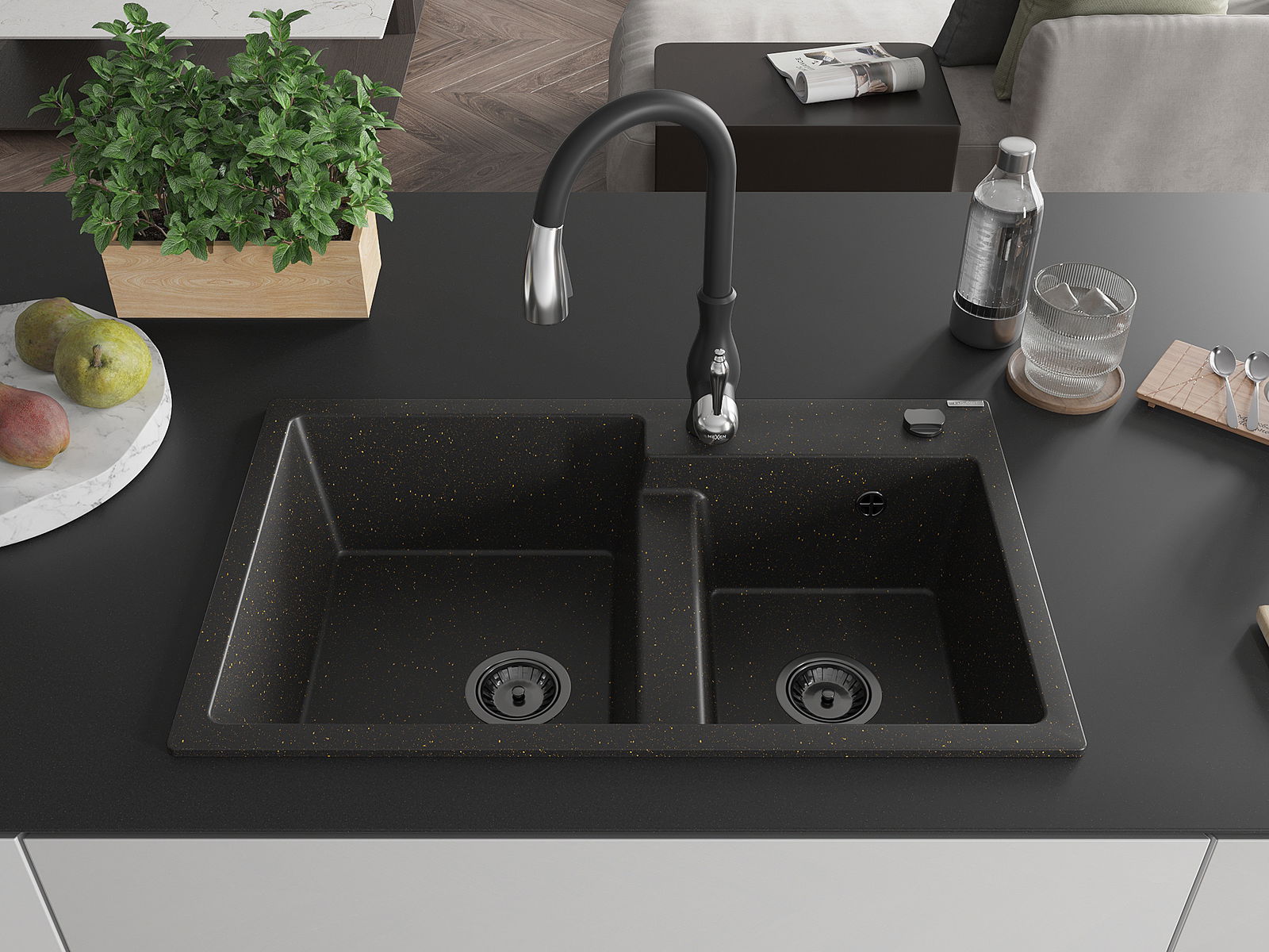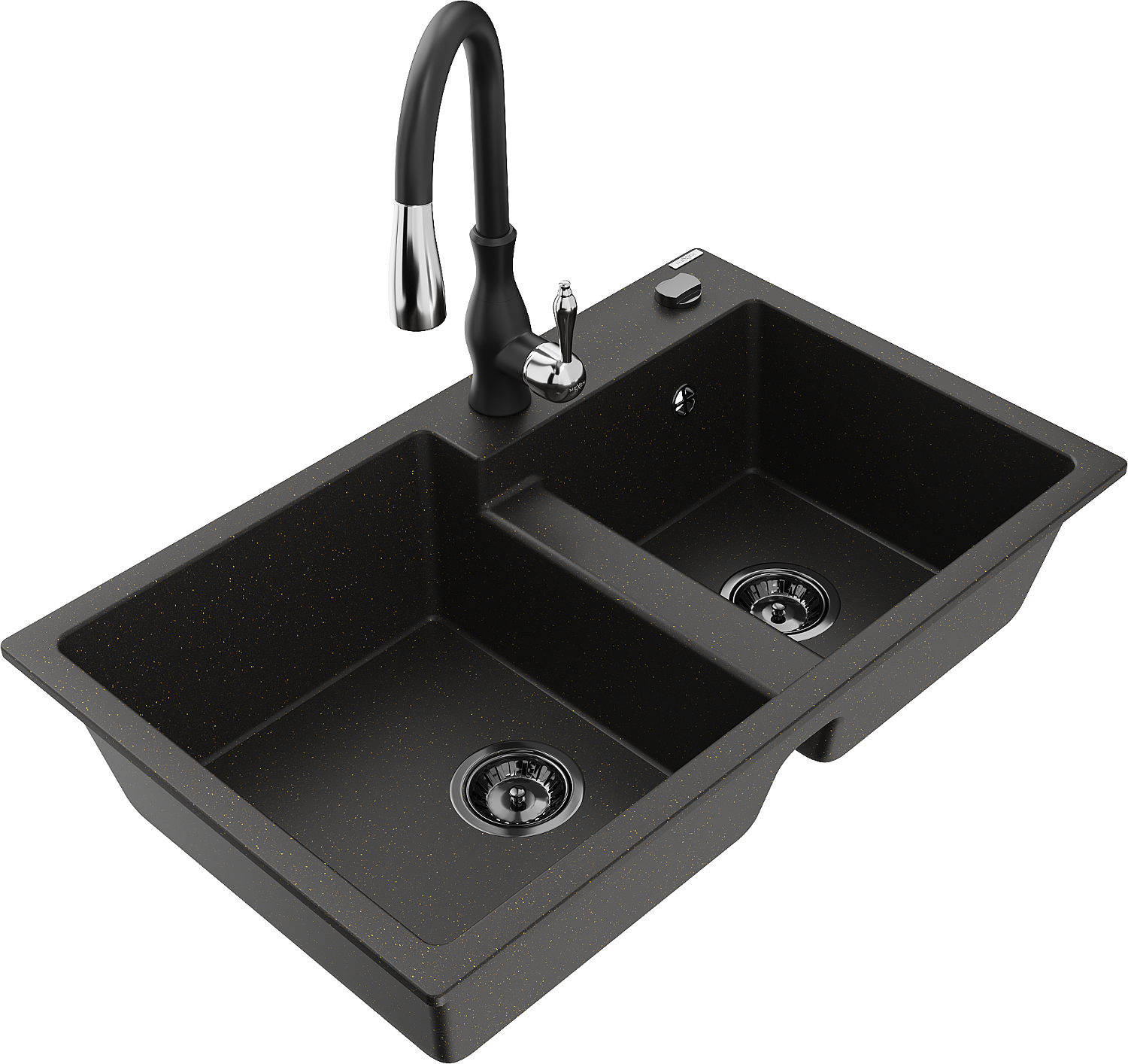 Mexen Tomas 2 kamrás gránit mosogató Savita konyhai csapteleppel, fekete/arany metál - 6516-75-672601-70-B