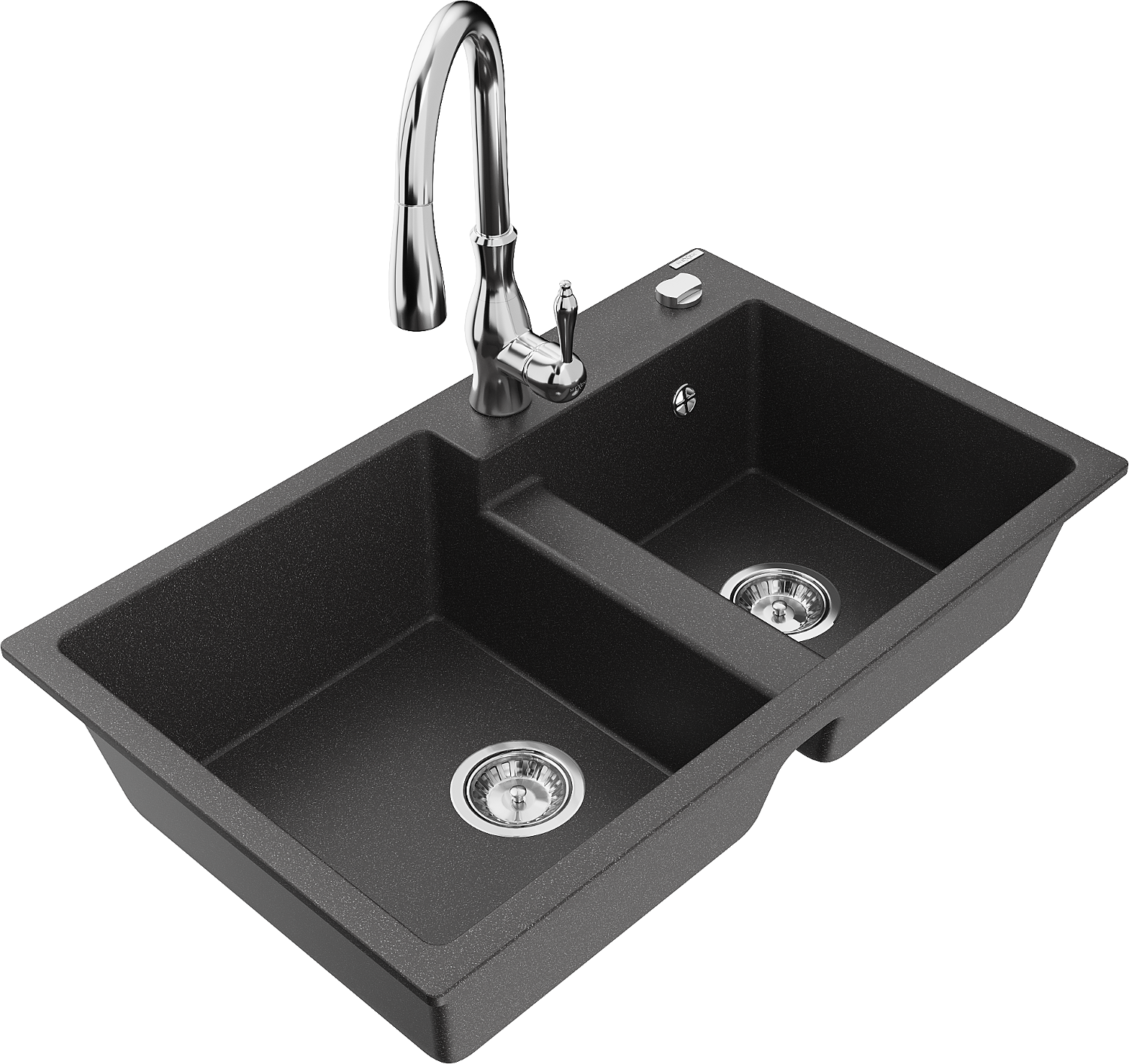 Mexen Tomas gránit konyhai mosogató 2 tálcás konyhai csapteleppel Savita, fekete pöttyös - 6516-76-672601-00