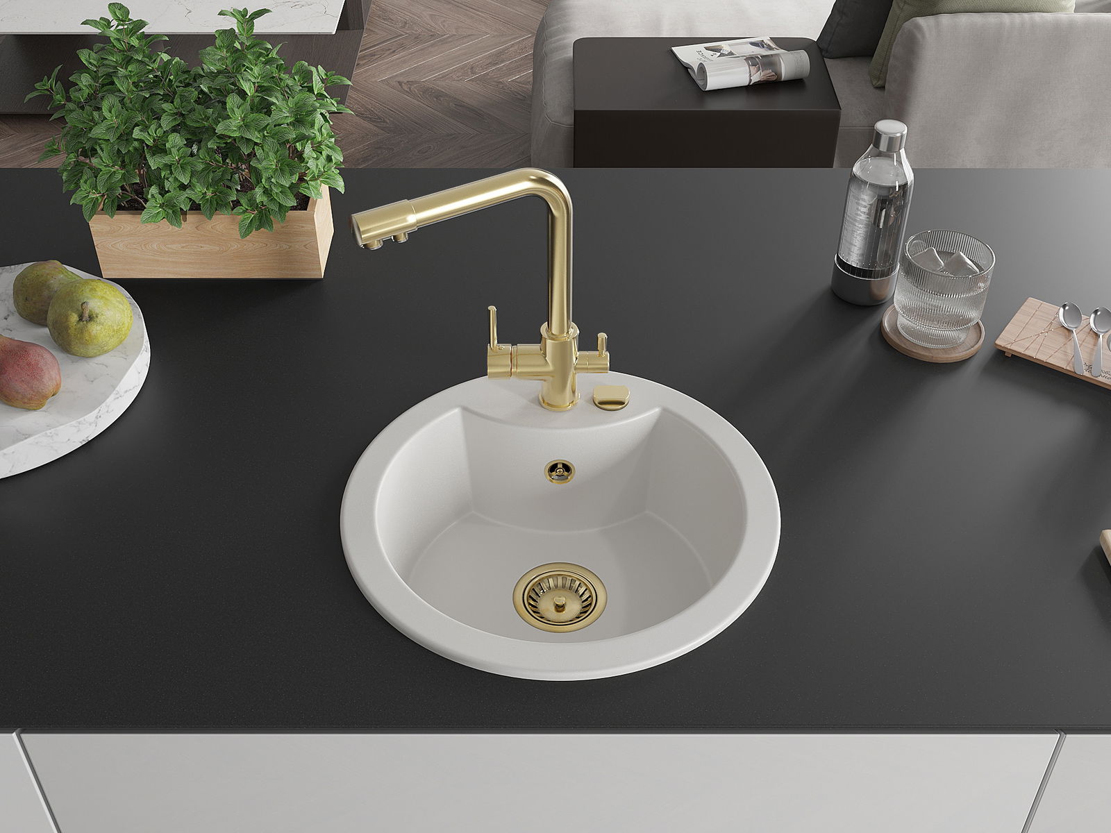A mosogató kiváló minőségű gránitból készül. Ez egy elegáns és mindenekelőtt minden konyhához praktikus kiegészítés, stílusától függetlenül. A kiváló minőségű és a gránit tartósság biztosítja a sok éves használatát.