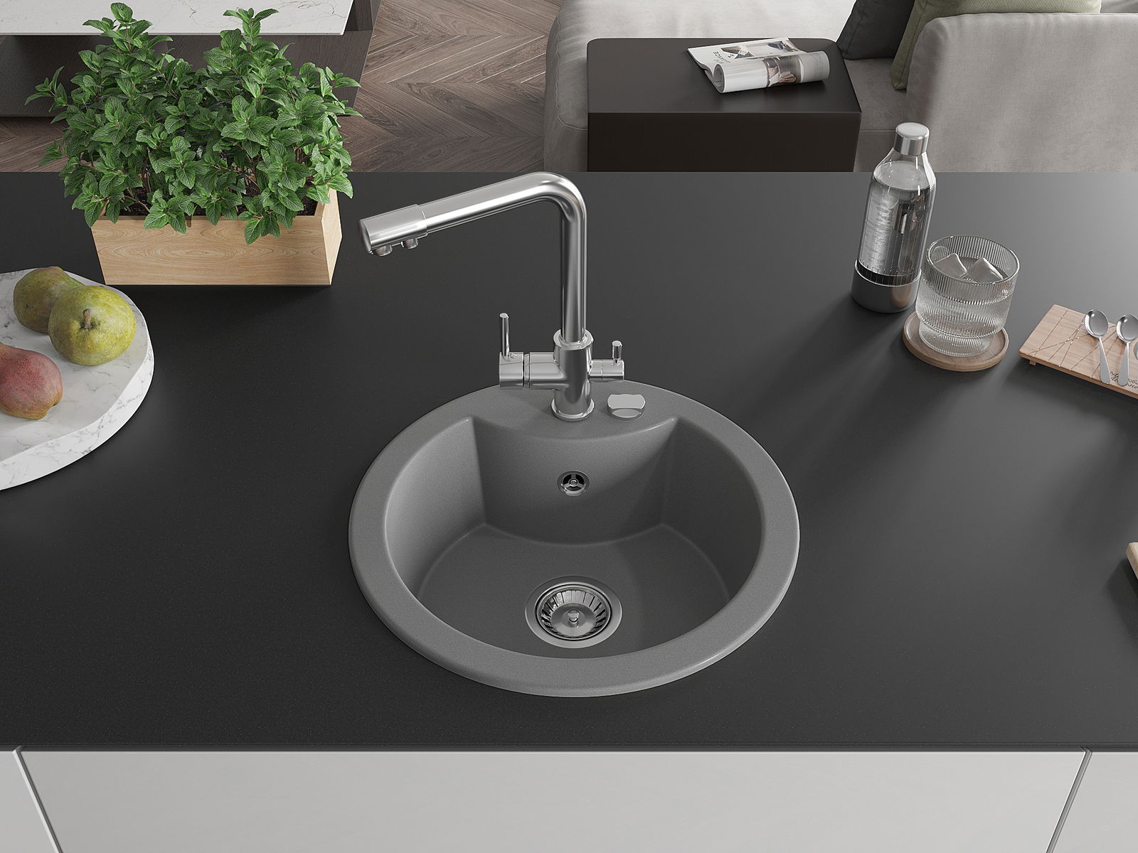 A mosogató kiváló minőségű gránitból készül. Ez egy elegáns és mindenekelőtt minden konyhához praktikus kiegészítés, stílusától függetlenül. A kiváló minőségű és a gránit tartósság biztosítja a sok éves használatát.
