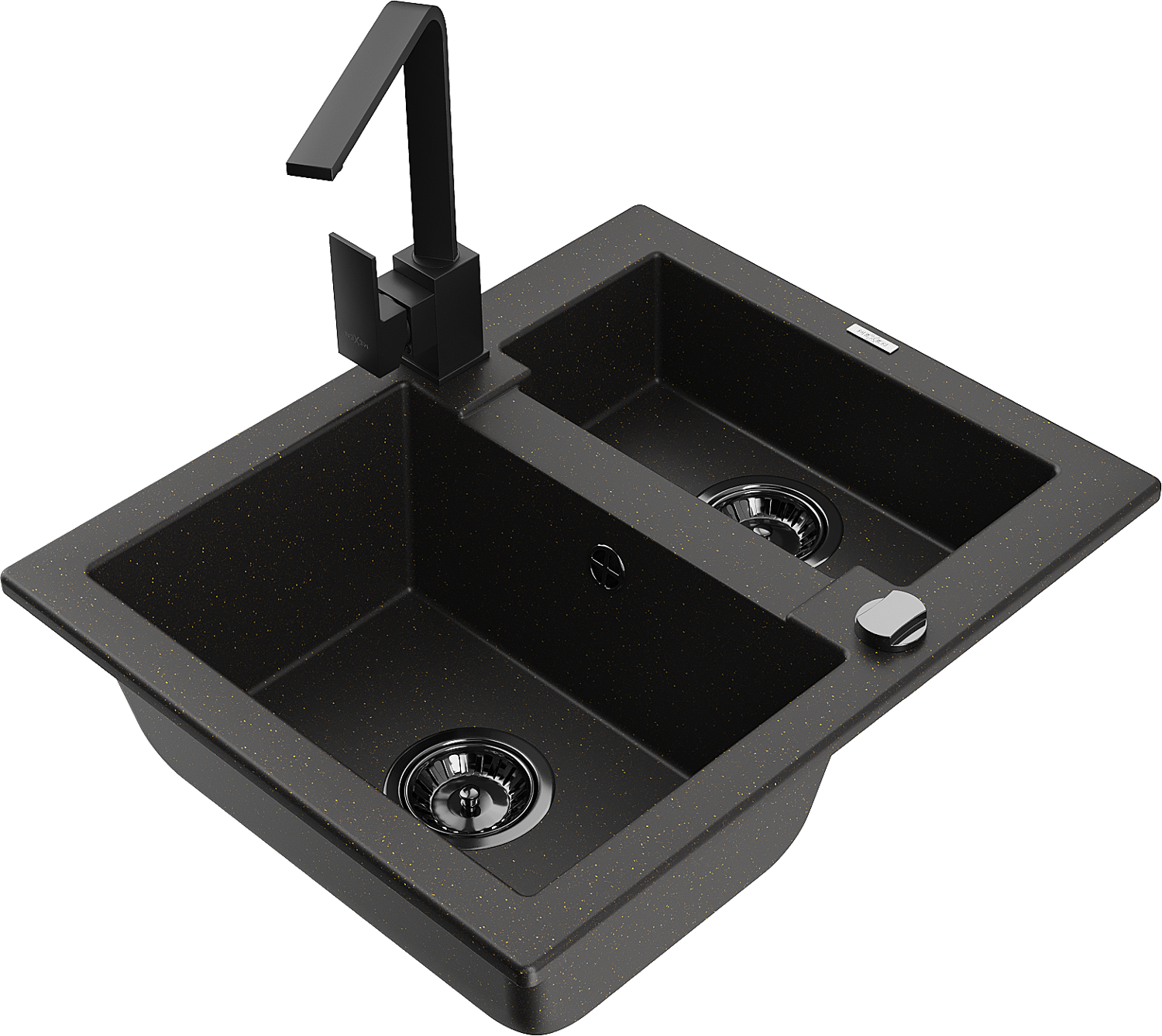 Mexen Carlos 1,5-medencés gránit mosogató Rita konyhai csappal, fekete/arany metál - 6518-75-670300-70-B
