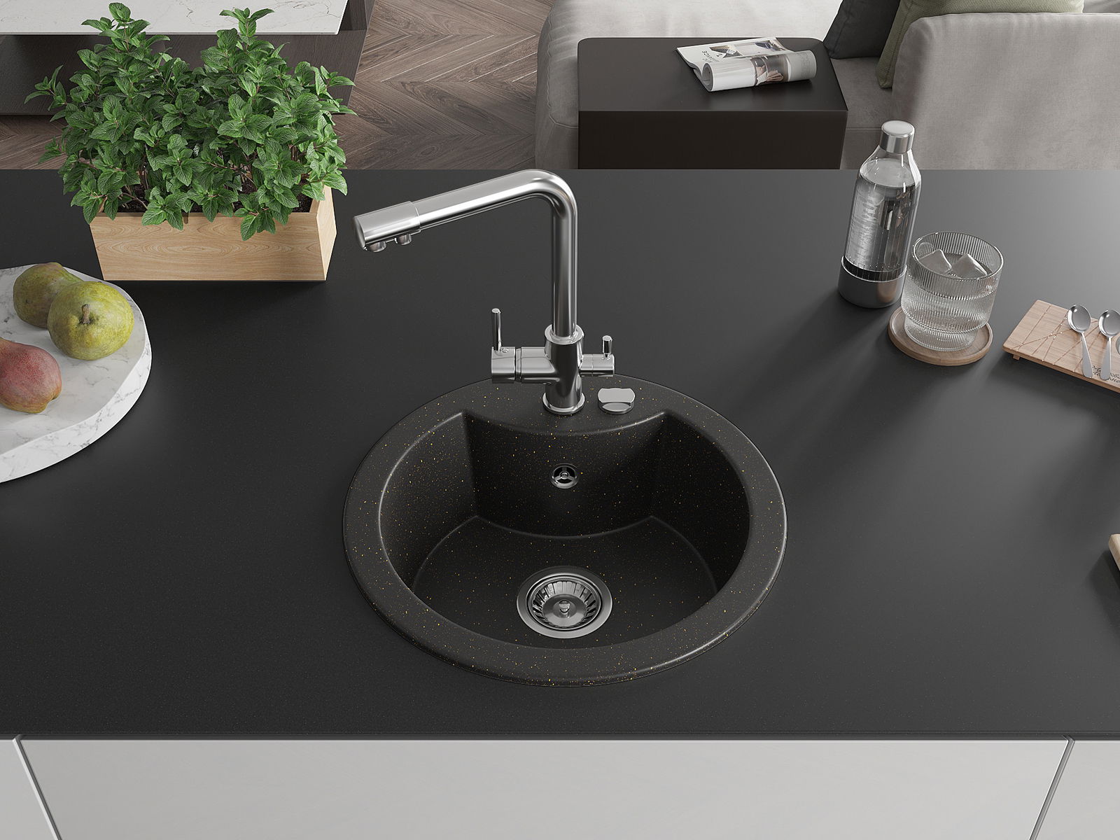 A mosogató kiváló minőségű gránitból készül. Ez egy elegáns és mindenekelőtt minden konyhához praktikus kiegészítés, stílusától függetlenül. A kiváló minőségű és a gránit tartósság biztosítja a sok éves használatát.