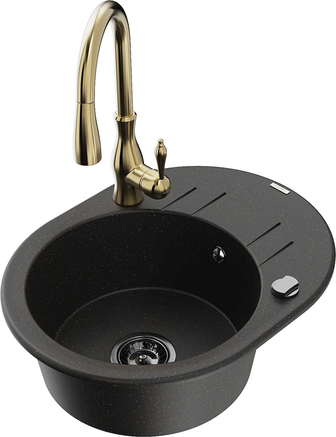 Mexen Kevin 1-medencés gránit mosogató lefolyóval és Savita konyhai csapteleppel, fekete/arany metál - 6517-75-672601-50-B