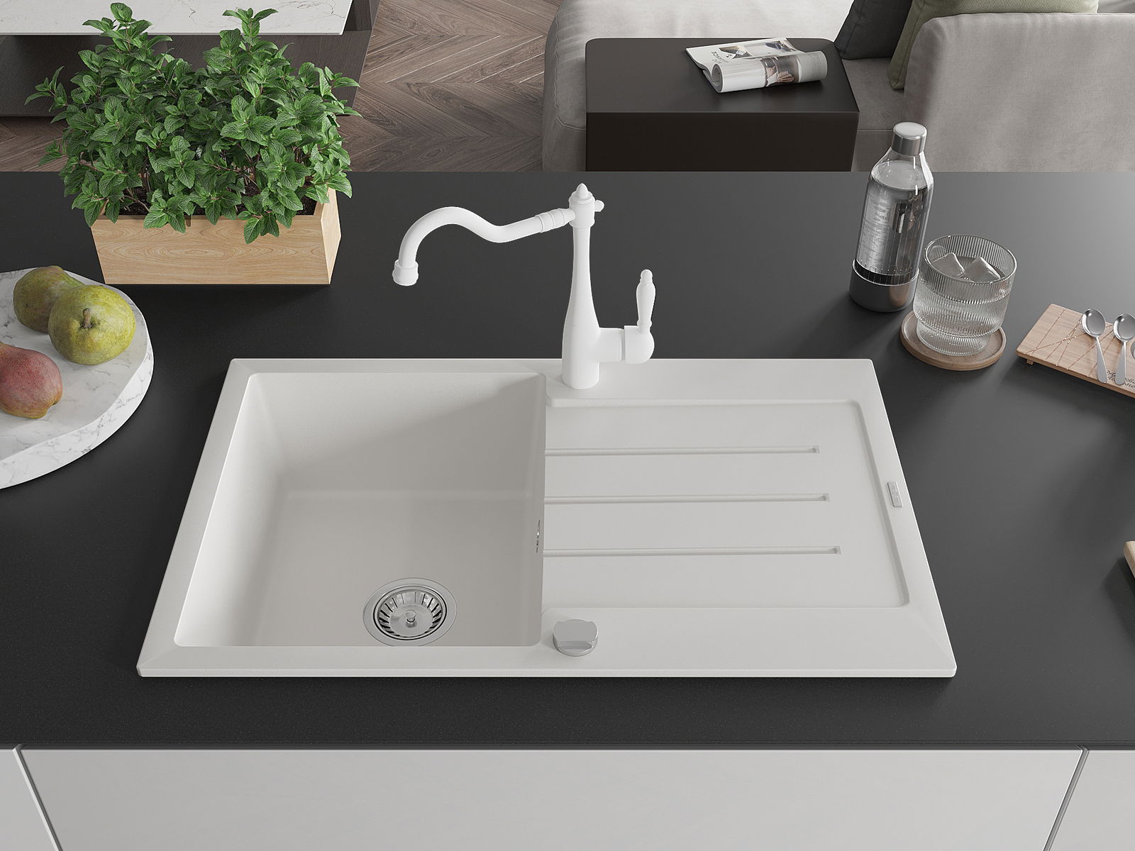 Mexen Bruno gránit mosogató 1-medencés csepegtetővel és Carla konyhai csapteleppel, fehér - 6513-20-670700-20