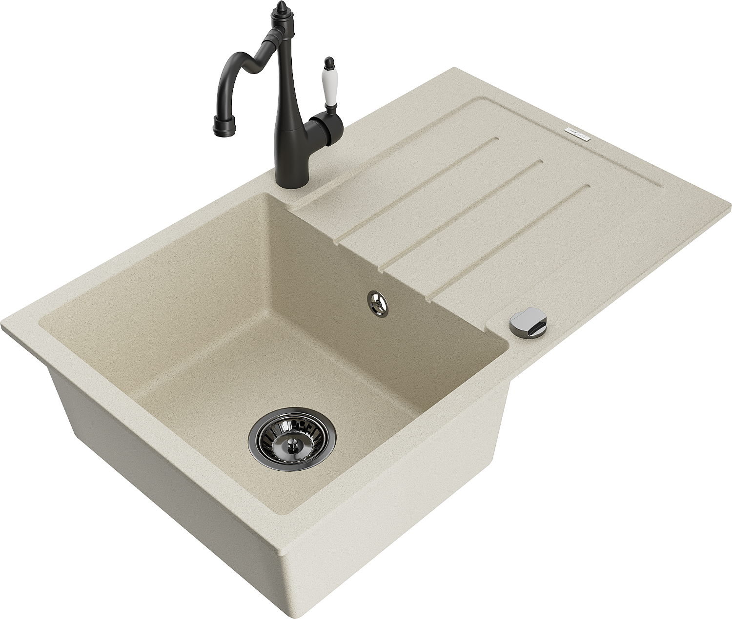 Mexen Bruno egymedencés, csepegtetős gránit mosogató és Carla konyhai csaptelep, bézs - 6513-69-670700-70