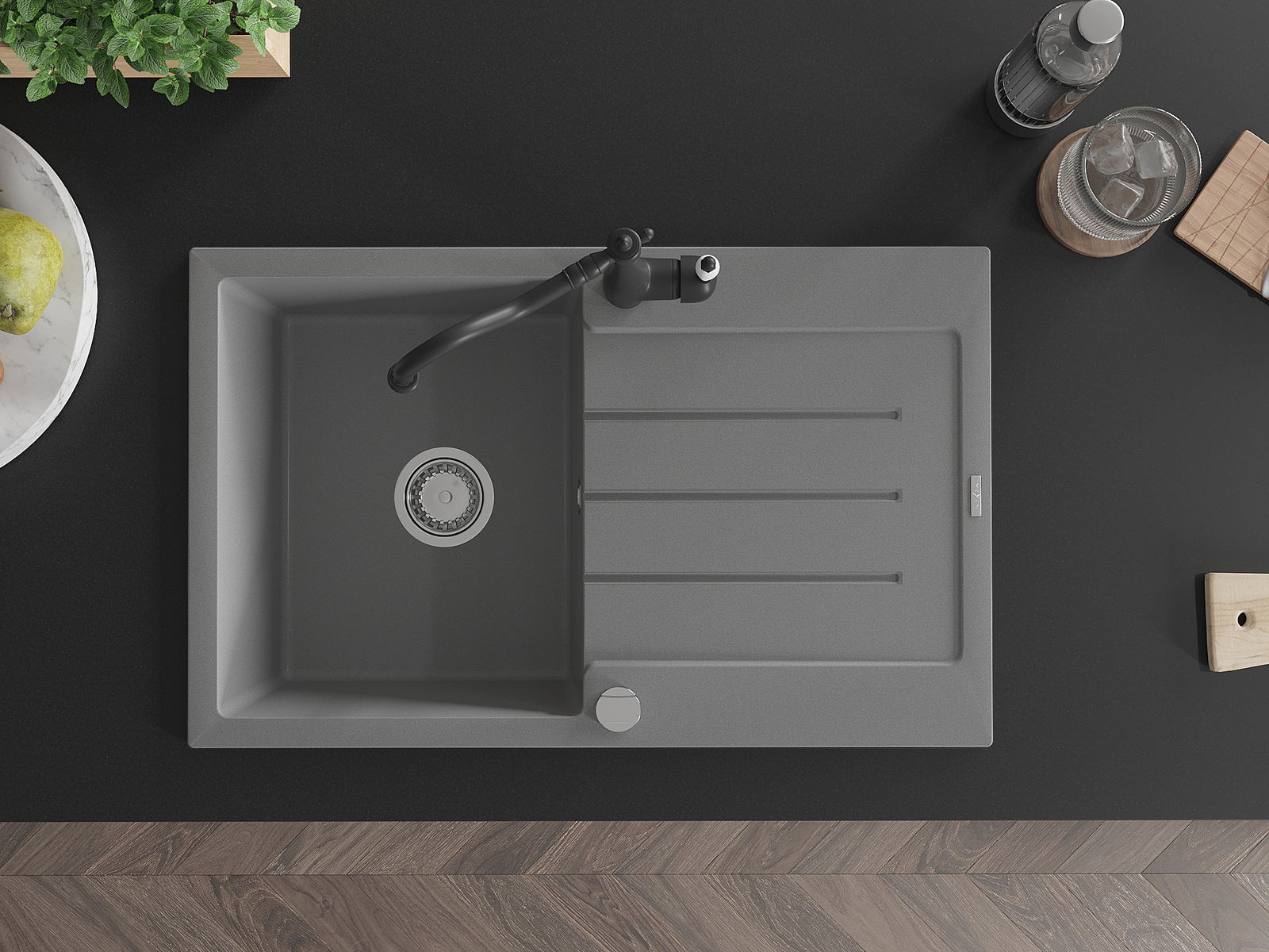 Mexen Bruno egymedencés gránit mosogató csepegtetővel és Carla konyhai csapteleppel, szürke - 6513-71-670700-70