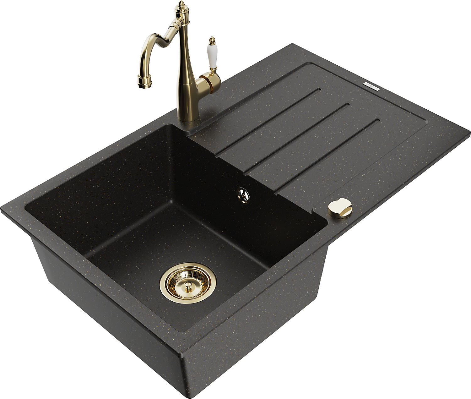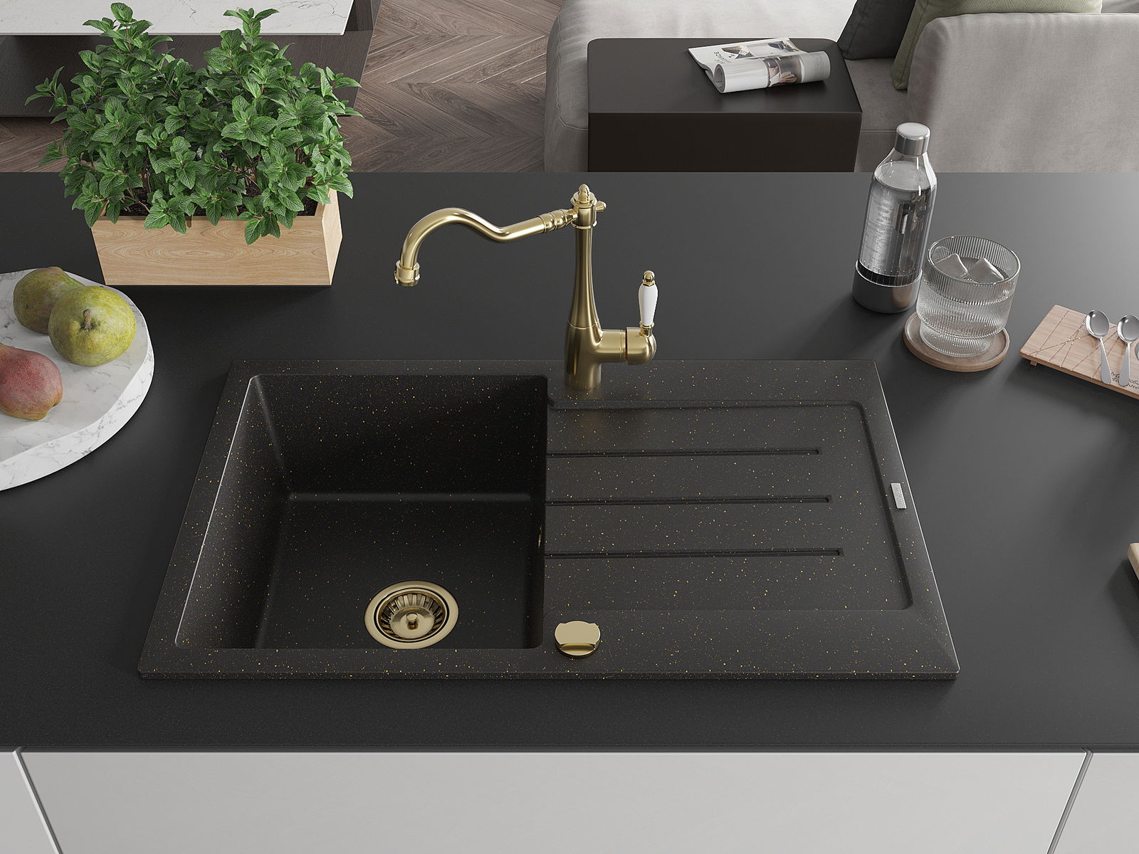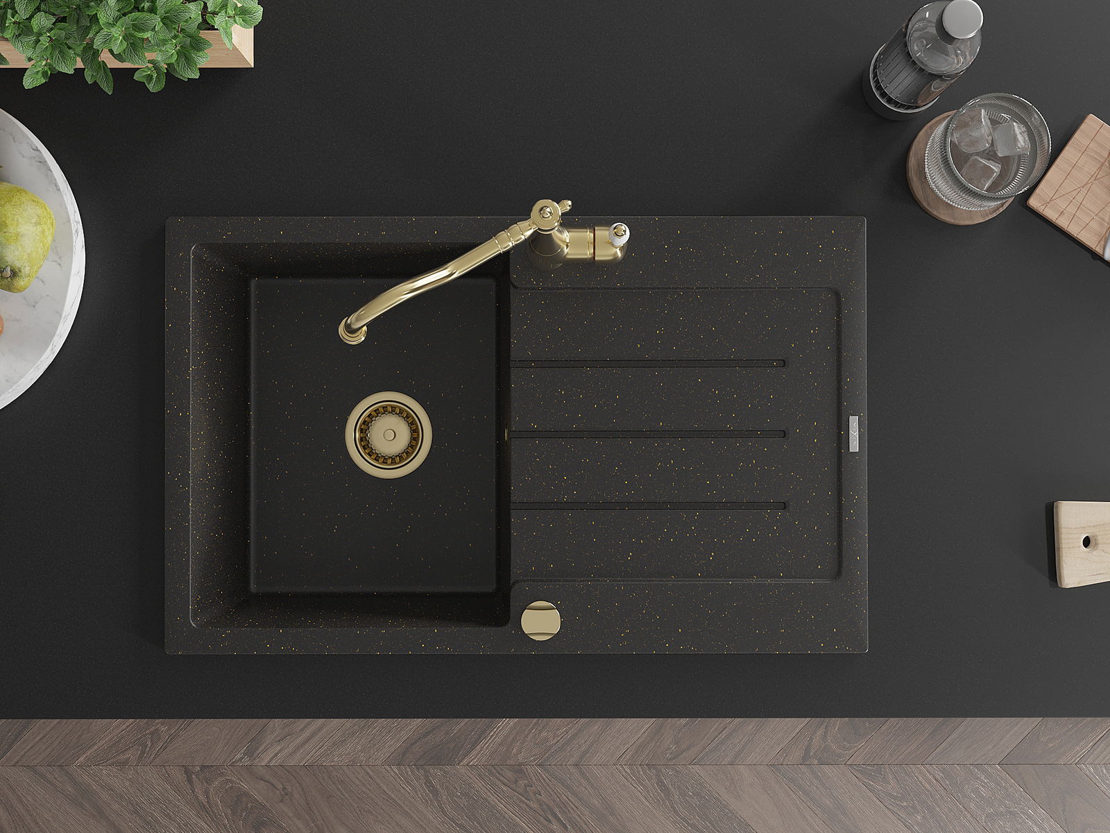 Mexen Bruno egymedencés gránit mosogató csepegtetővel és Carla konyhai csapteleppel, fekete/arany metál - 6513-75-670700-50