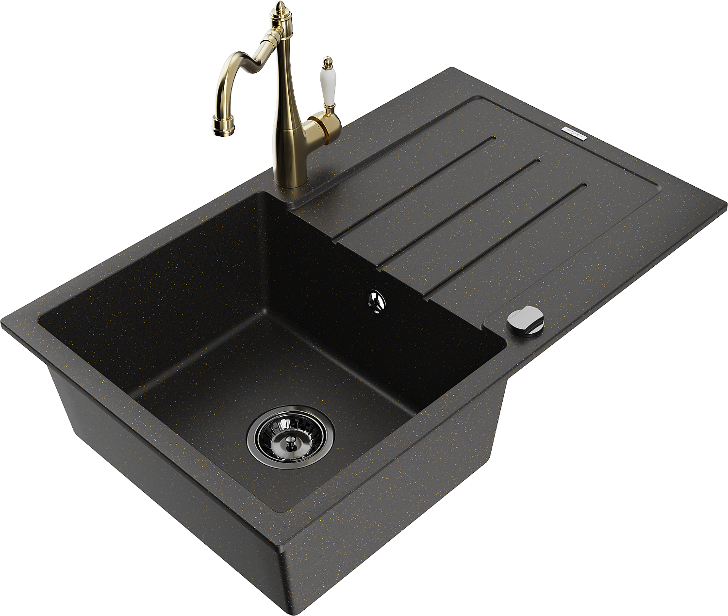 Mexen Bruno 1-kamrás gránit mosogató csepegtetővel és Carla konyhai csappal, fekete/arany metál - 6513-75-670700-50-B