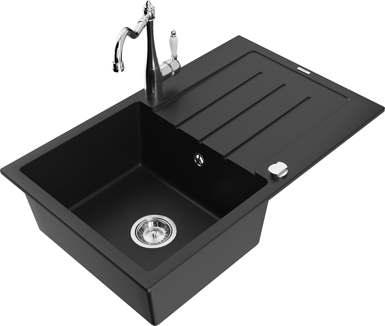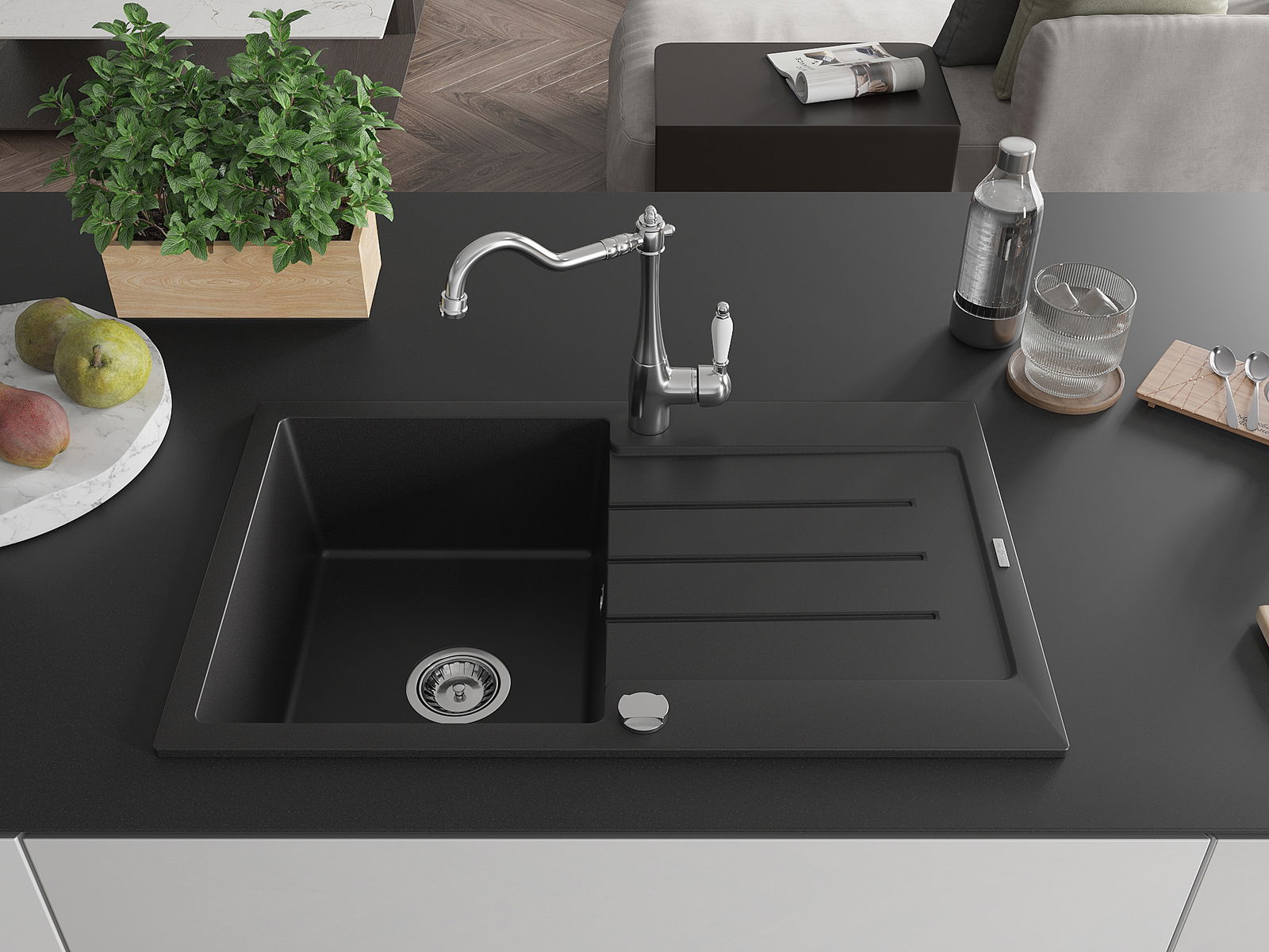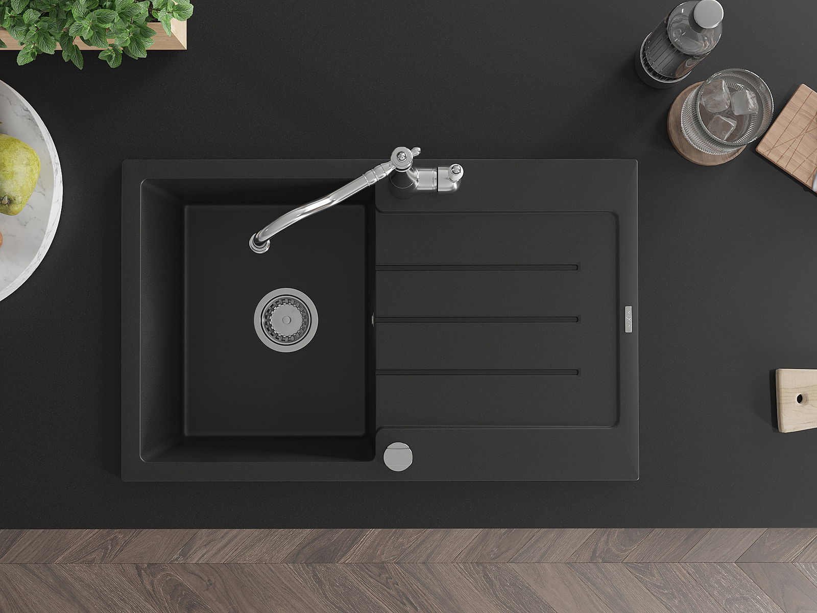 A mosogató magas minőségű gránitból készült. Elegáns, de mindenekelőtt praktikus kiegészítője minden konyhának, függetlenül annak stílusától. A gránit magas minősége és tartóssága hosszú távú használatot biztosít.