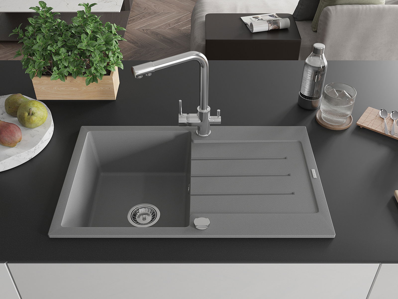 A mosogató kiváló minőségű gránitból készül. Ez egy elegáns és mindenekelőtt minden konyhához praktikus kiegészítés, stílusától függetlenül. A kiváló minőségű és a gránit tartósság biztosítja a sok éves használatát.