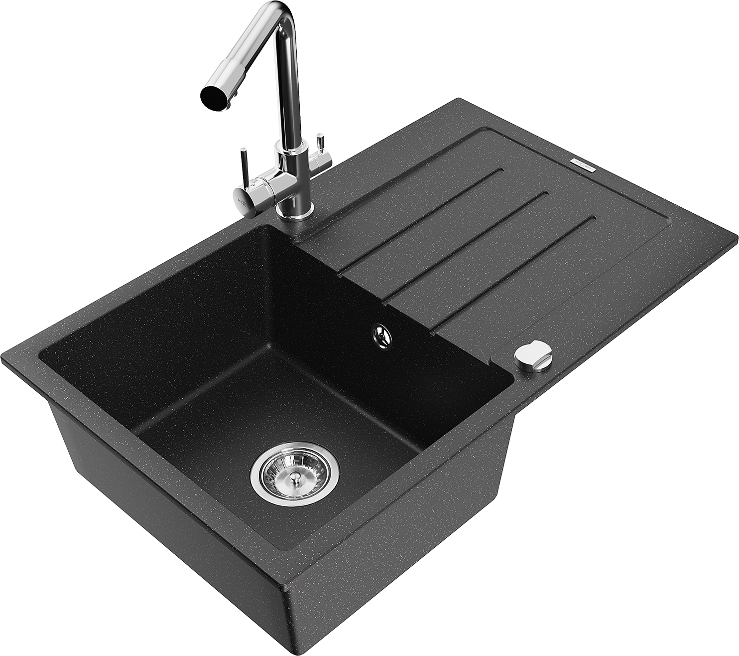 Mexen Bruno 1 rekeszes gránit mosogató csepegtetővel és Duero konyhai csappal, fekete/ezüst metál - 6513-73-671600-00
