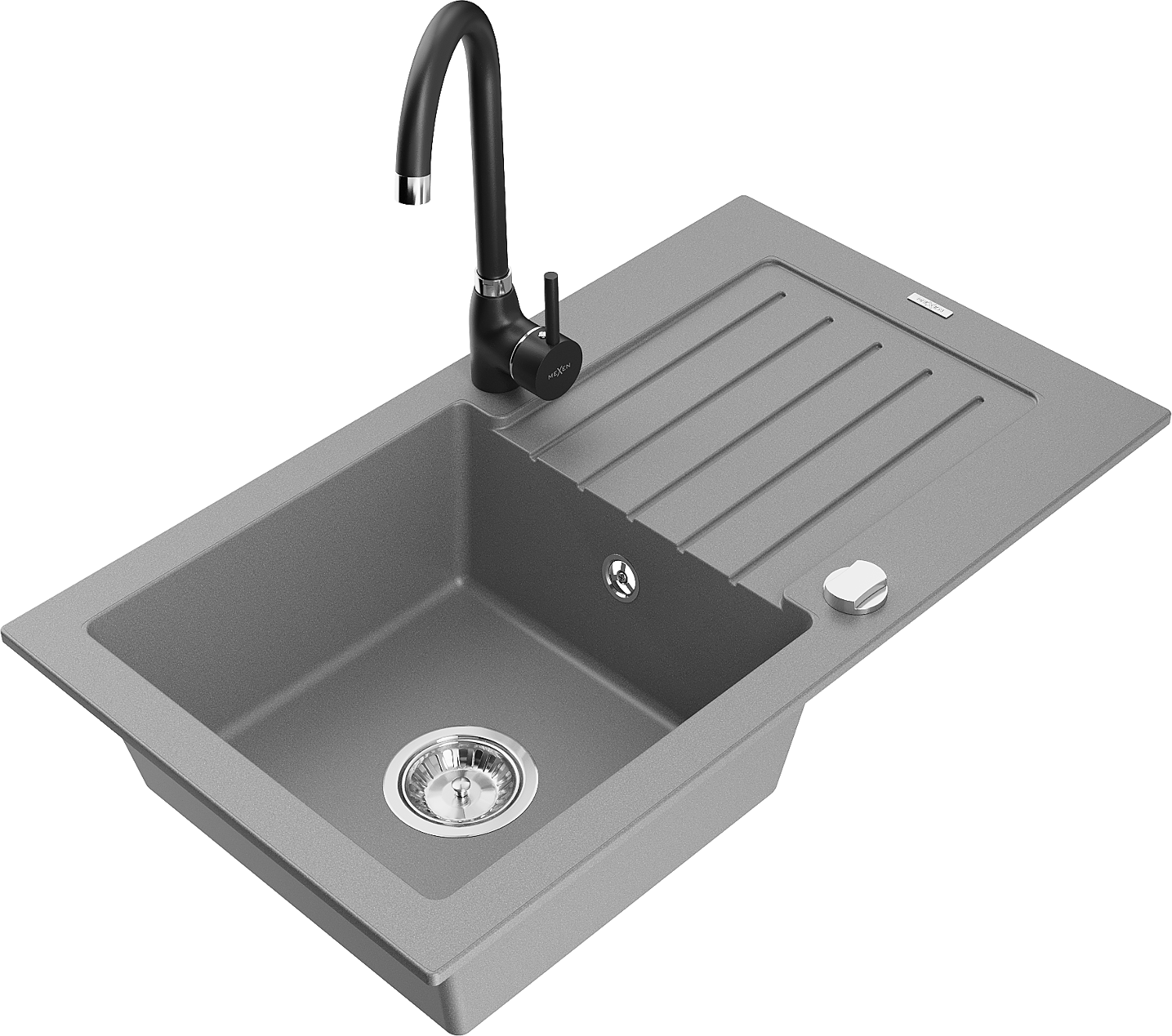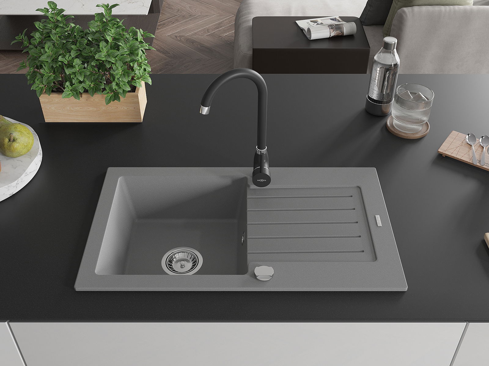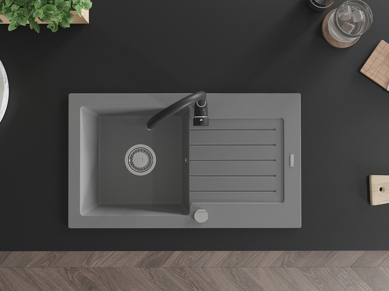 Mexen Pablo egymedencés gránit mosogató csepegtetővel és Telma konyhai csapteleppel, szürke - 6510-71-670200-70
