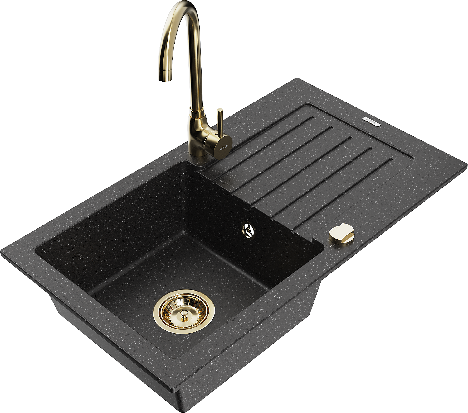 Mexen Pablo gránit egytálcás mosogató csepegtetővel és Telma konyhai csappal, fekete/ezüst - 6510-73-670200-50