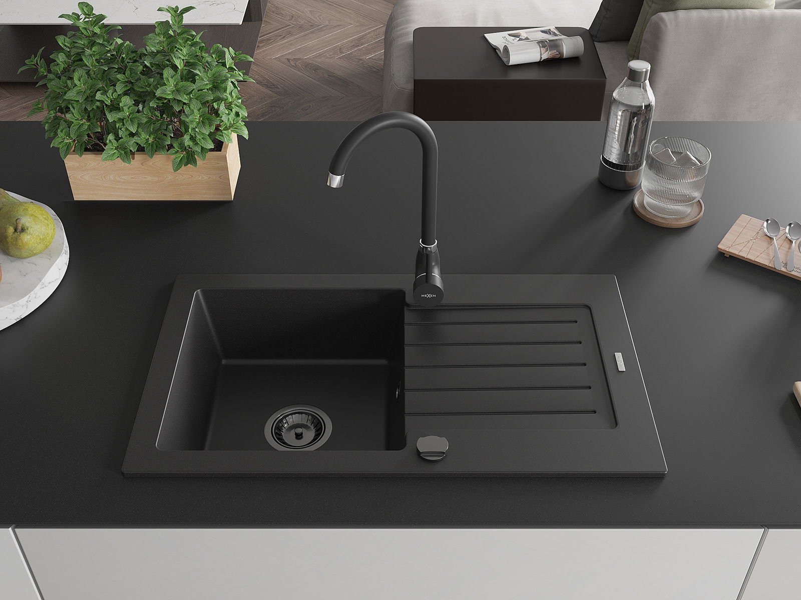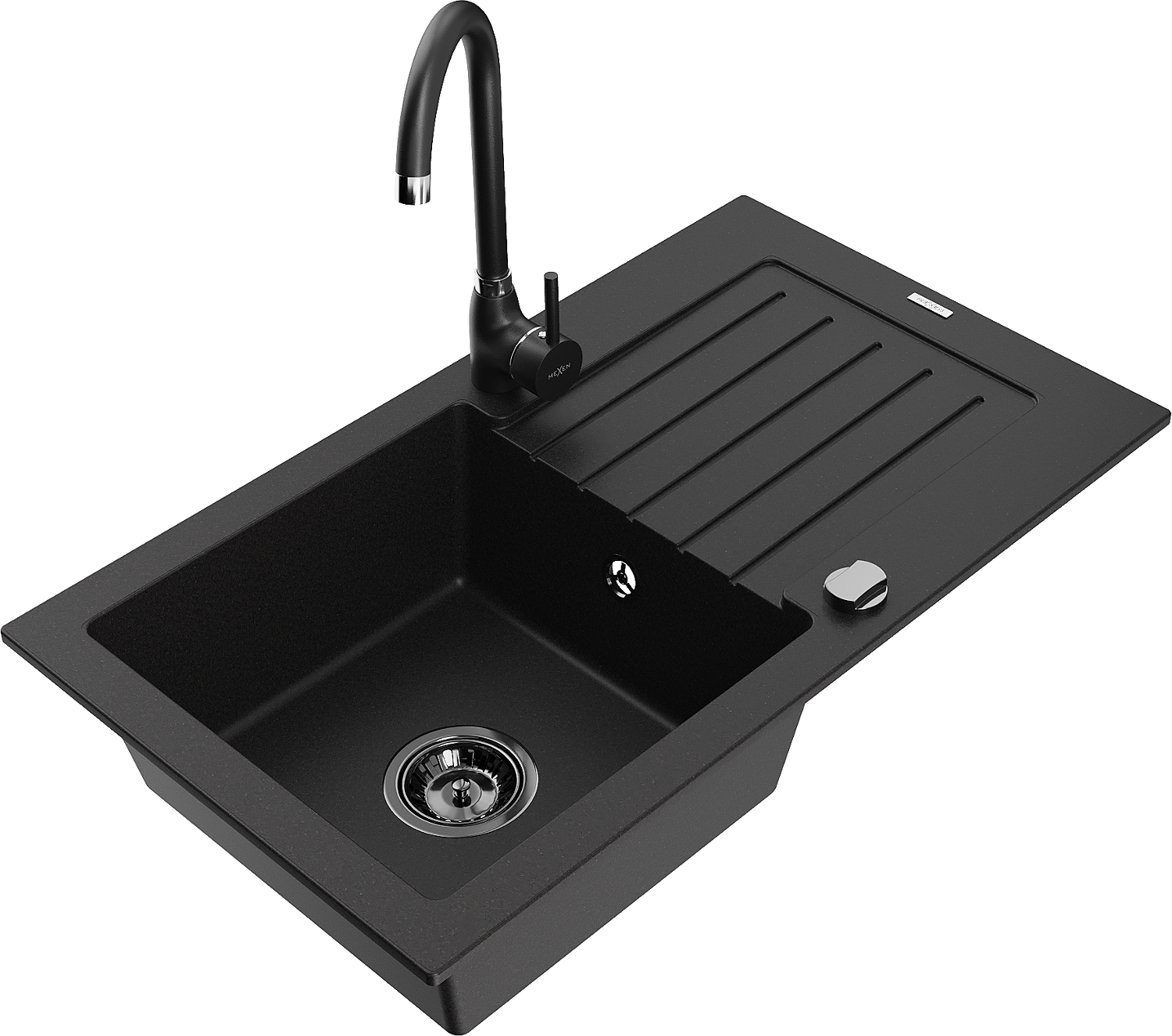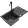 Mexen Pablo 1 rekeszes gránit mosogató csepegtetővel és Telma konyhai csappal, fekete - 6510-77-670200-70-B