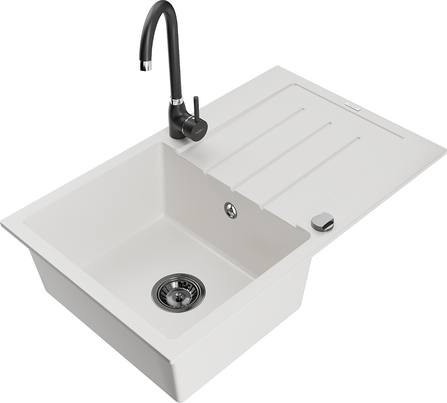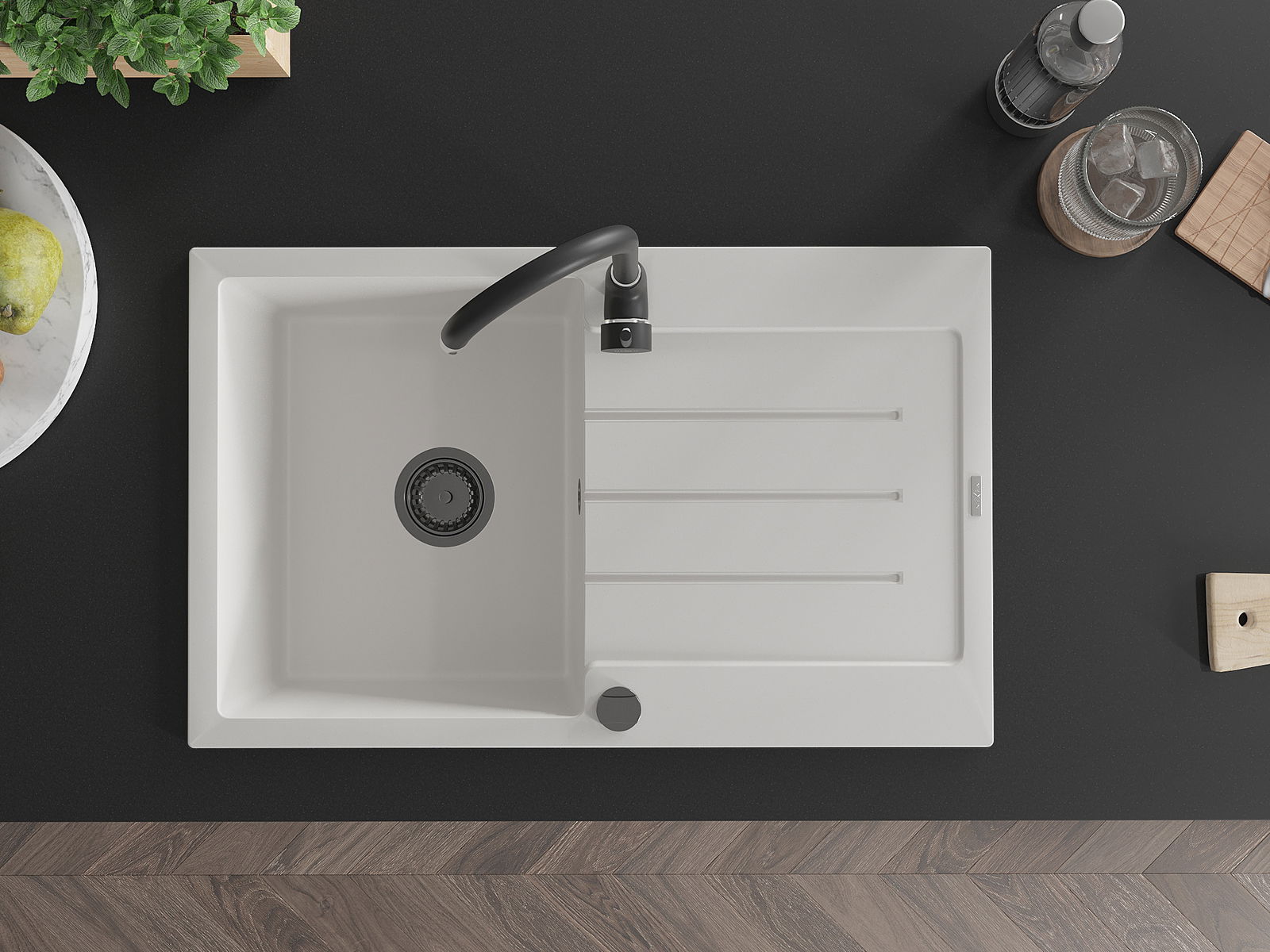 Mexen Bruno 1-medencés gránit mosogató csepegtetővel és Telma konyhai csapteleppel, fehér - 6513-20-670200-70