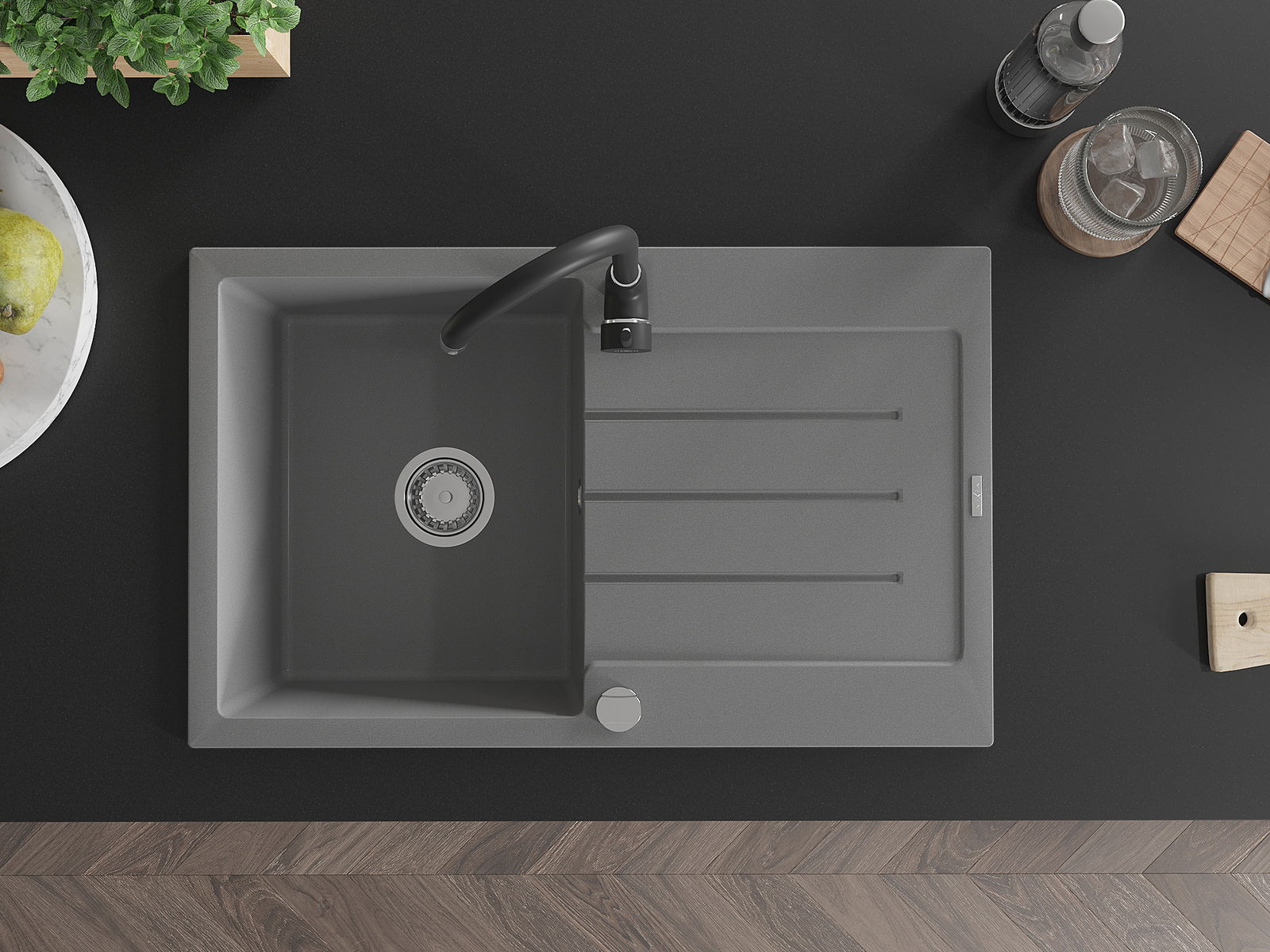 A mosogató kiváló minőségű gránitból készül. Ez egy elegáns és mindenekelőtt minden konyhához praktikus kiegészítés, stílusától függetlenül. A kiváló minőségű és a gránit tartósság biztosítja a sok éves használatát.