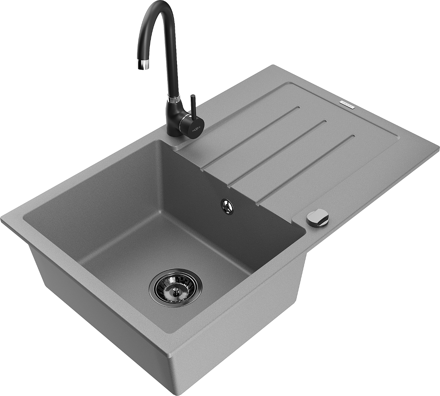 Mexen Bruno gránit mosogatótálca, 1 rekeszes, csepptálcával és Telma konyhai csapteleppel, szürke - 6513-71-670200-70-B