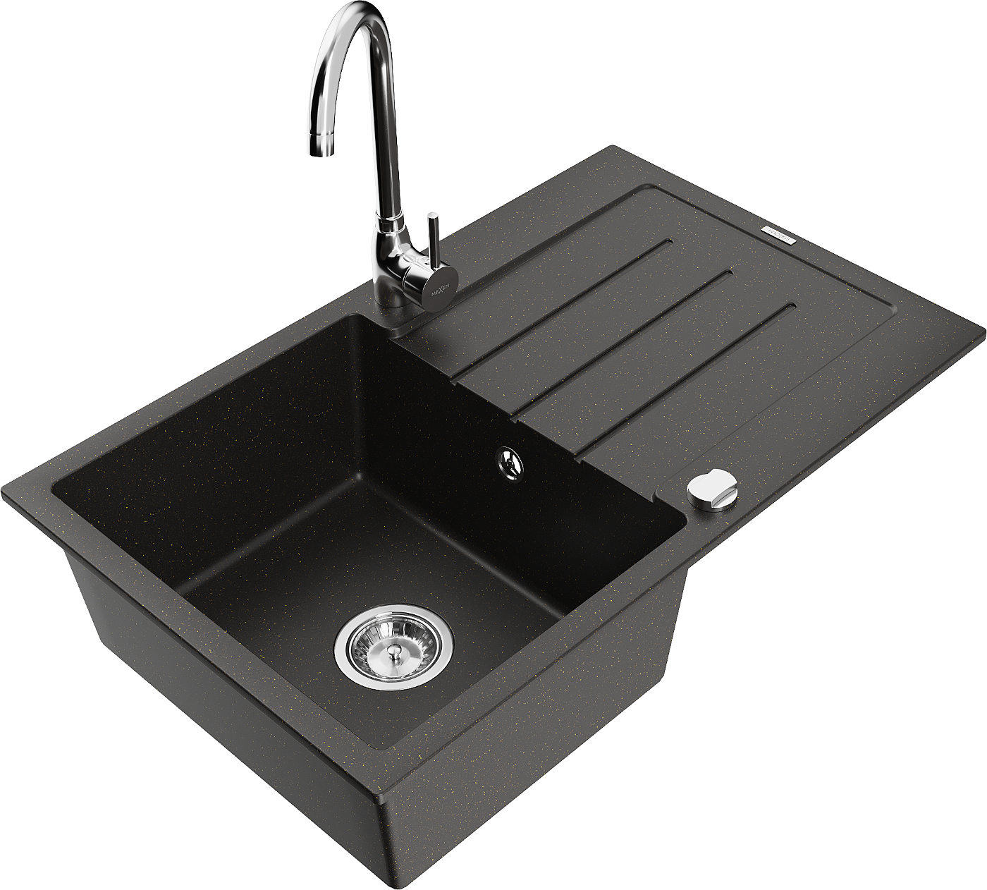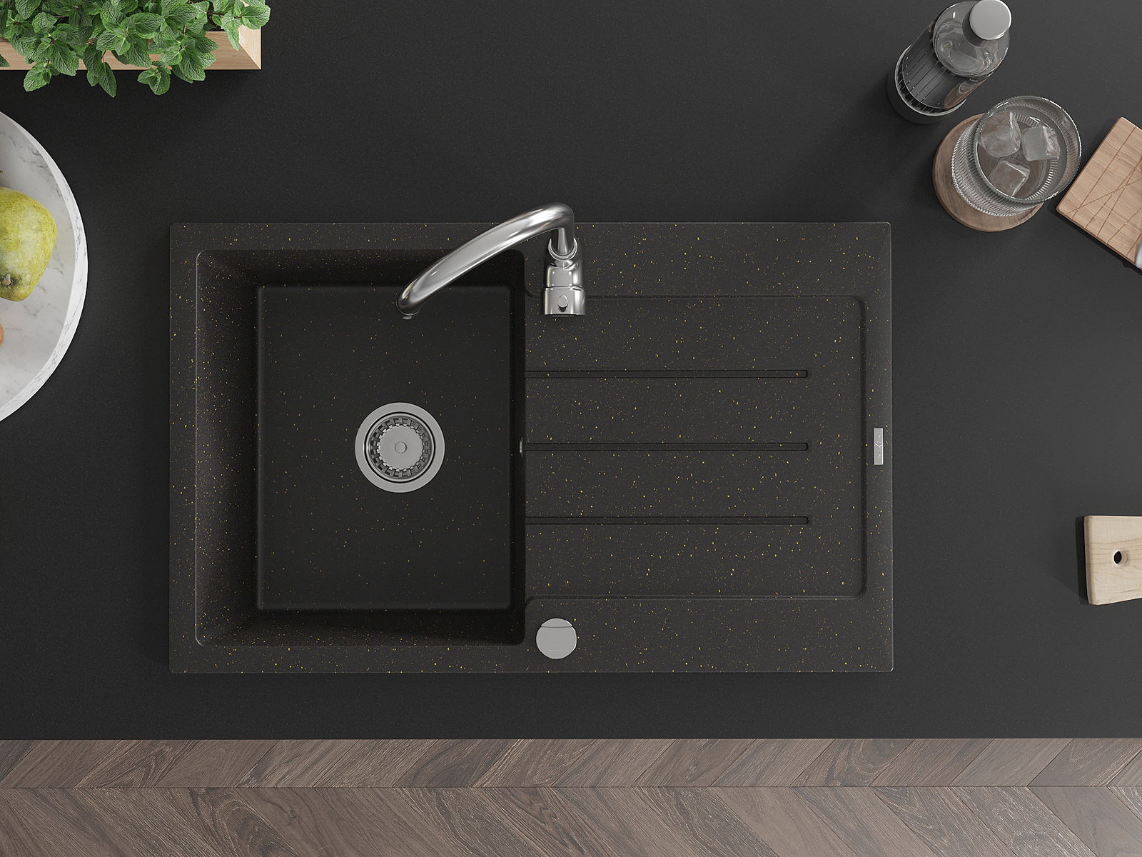 Mexen Bruno 1 rekeszes gránit mosogatótálca csepegtetővel és Telma konyhai keverőcsappal, fekete/arany - 6513-75-670200-00