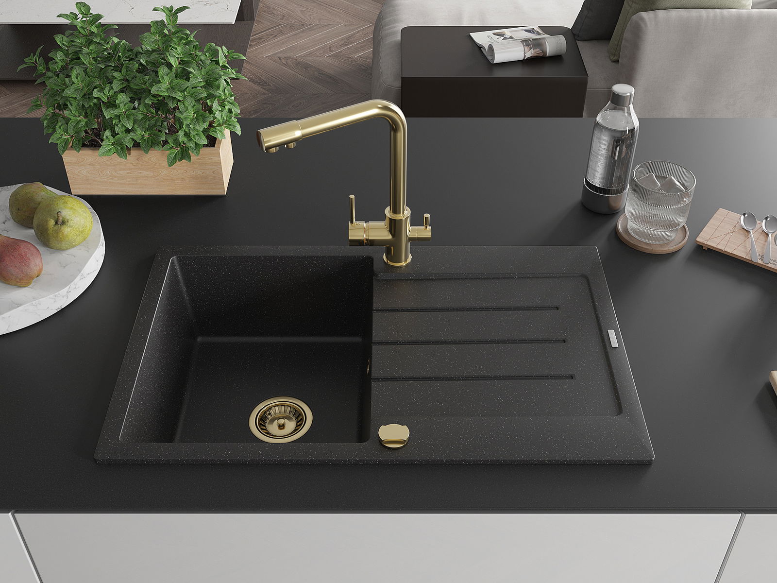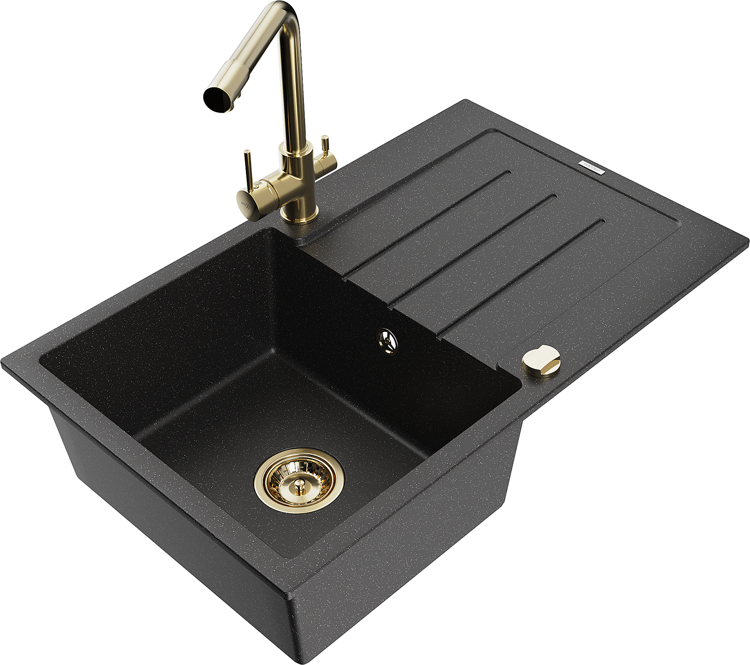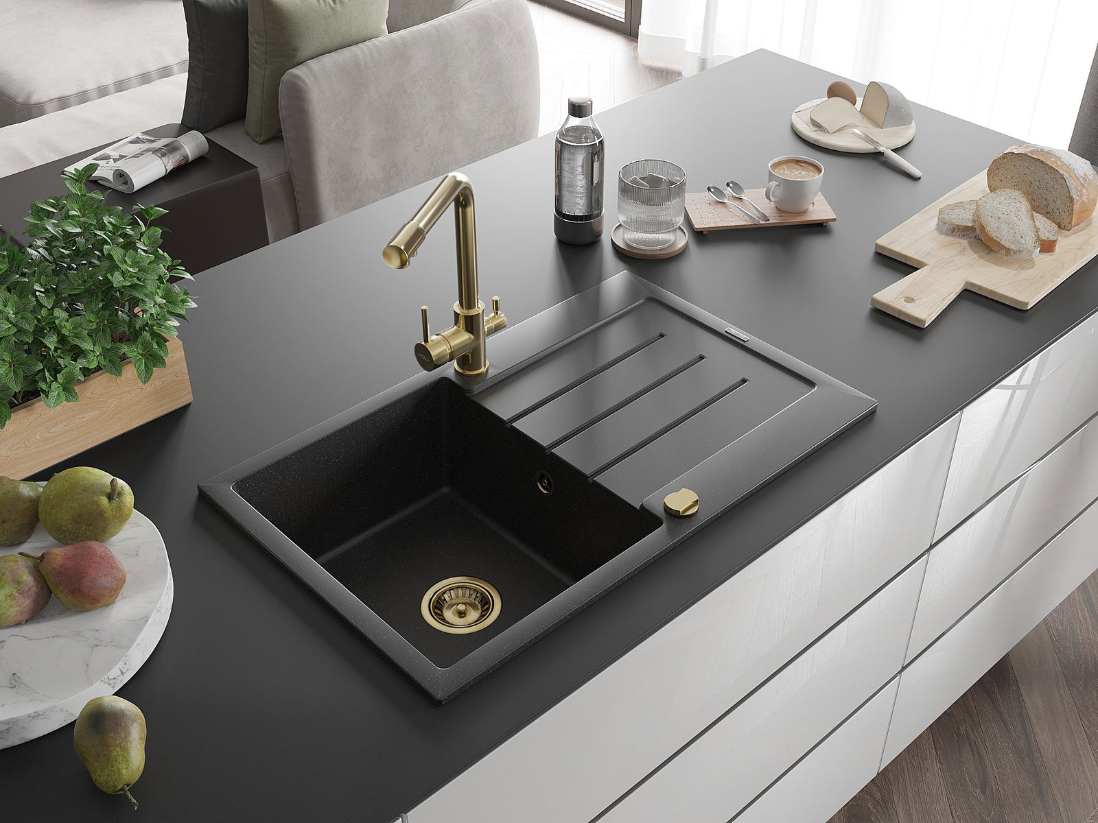 A mosogató magas minőségű gránitból készült. Elegáns, de mindenekelőtt praktikus kiegészítője minden konyhának, függetlenül annak stílusától. A gránit magas minősége és tartóssága hosszú távú használatot biztosít.