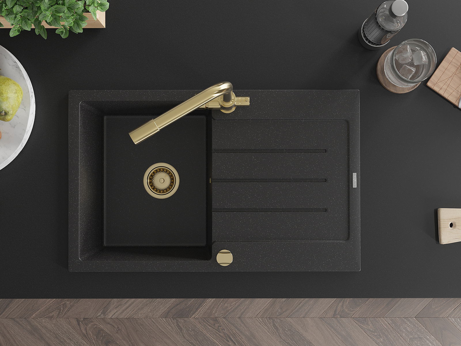 Mexen Bruno gránit mosogató 1-medencés csepegtetővel és Duero konyhai csappal, fekete/ezüst metál - 6513-73-671600-50
