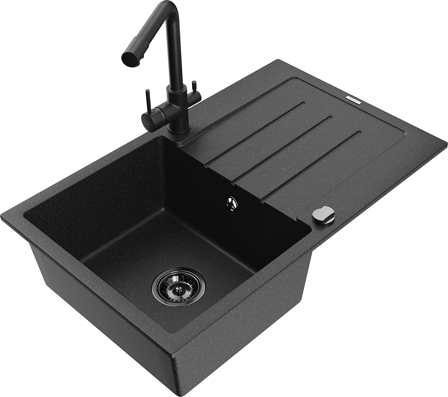 Mexen Bruno gránit egytálcás mosogató csepegtetővel és Duero konyhai csapteleppel, fekete/ezüst metál - 6513-73-671600-70-B